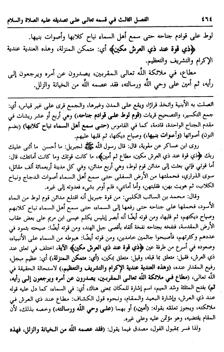 وقال: محمد بن السائب الكلبي: من قوة جبريل أنه اقتلع مدائن قوم لوط من الماء الأسود، فحملها على جناحه حتى رفعها إلى السماء، حتى سمع أهل السماء نباح كلابهم وصياح ديكتهم، ثم قلبها، ومن قوته أيضا أنه أبصر إبليس يكلم عيسى ابن مريم على بعض عقاب الأرض المقدسة، فنفخه بجناحه نفخة ألقاه بأقصى جبل الهند، ومن قوته أيضًا: صيحته بثمود في عددهم وكثرتهم، فأصبحوا جاثمين خامدين، ومن قوته أيضًا: هبوطه من السماء على الأنبياء، وصعوده في أسرع من طرفة عين {ذِي قُوَّةٍ عِنْدَ ذِي الْعَرْشِ مَكِينٍ} الآية، اختلف في تعلق عند ذي العرش، فقيل: متعلق بما قبله، وقيل: متعلق بمكين، "أي: متمكن المنزلة" أيك عظم مبجل، رفيع المقدار عنده، "وهذه العندية عندية الإكرام والتشريف والتعظيم" لاستحالة الحقيقة في الله تعالى: "مطاع في ملائكة الله تعالى المقربين، يصدرون عن أمره ويرجعون إلى رأيه، ثم" بفتح المثلثة وشد الميم، اسم إشارة للمكان بمعنى هناك، أي: في السماء، كما دل عليه قوله عند ذي العرش، وإشارة البعيد والمقام، ونحوه قول الكشاف: مطاع عند ذي العرش في ملائكته، ويجوز تعلقه بقوله: "أمين" أو بهما "على وحي الله ورسالته" وخصه بذلك؛ لأن المقام يقتضيه، وهو مؤتمن عليه وعلى غيره.