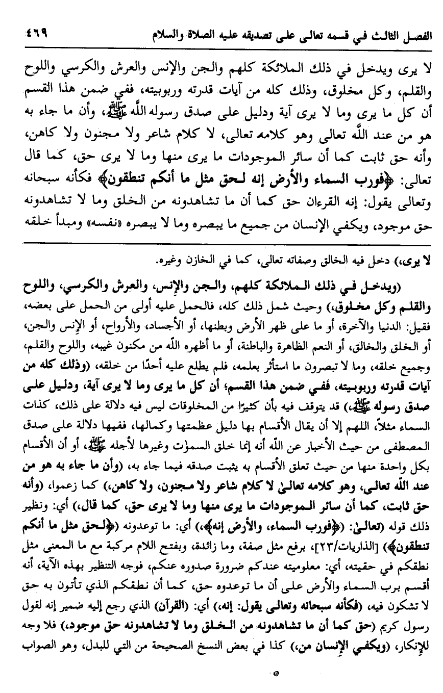 "ويدخل في ذلك الملائكة كلهم والجن والإنس والعرش والكرسي واللوح والقلم، وكل مخلوق" وحيث شمل ذلك كله، فالحمل عليه أولى من الحمل على بعضه، فقيل: الدنيا والآخرة، أو ما على ظهر الأرض وبطنها، أو الأجساد، والأرواح، أو الإنس والجن، أو الخلق والخالق، أو النعم الظاهرة والباطنة، أو ما أظهره الله من مكنون غيبه، واللوح والقلم، وجميع خلقه، وما لا تبصرون ما استأثر بعلمه، فلم يطلع عليه أحدًا من خلقه، "وذلك كله من آيات قدرته وربوبيته، ففي ضمن هذا القسم أن كل ما يرى وما لا يرى آية ودليل على صدق رسول الله صلى الله عليه وسلم"، قد يتوقف فيه بأن كثيرًا من المخلوقات ليس فيه دلالة على ذلك، كذات السماء مثلًا، اللهم إلا أن يقال: الأقسام بها دليل عظمتها، وكمالها، ففيها دلالة على صدق المصطفى من حيث الأخبار عن الله أنه إنما خلق السماوات وغيرها لأجله صلى الله عليه وسلم، أو أن الأقسام بكل واحدة منها من حيث تعلق الأقسام به يثبت صدقه فيما جاء به، "وأن ما جاء به هو من عند الله تعالى وهو كلامه تعالى، لا لام شاعر ولا مجنون ولا كاهن" كما زعموا، "وأنه حق ثابت كما أن سائر الموجودات ما يرى منها وما لا يرى حق، كما قال"، أي: ونظير ذلك قوله تعالى: " {فَوَرَبِّ السَّمَاءِ وَالْأَرْضِ إِنَّهُ} " أي: ما توعدونه " {لَحَقٌّ مِثْلَ مَا أَنَّكُمْ تَنْطِقُونَ} " [الذاريات: 23] ، يرفع مثل صفة، وما زائدة، وبفتح اللام مركبة مع ما المعنى مثل نطقكم في حقيته، أي: معلوميته عندكم ضرورة صدوره عنكم، فوجه التنظير بهذه الآية، أنه أقسم برب السماء والأرض على أن ما توعدوه حق، كما أن نطقكم الذي تأتون به حق لا تشكون فيه، "فكأنه سبحانه وتعالى يقول: إنه" أي: "القرآن" الذي رجع إليه ضمير إنه لقول رسول كريم "حق كما أن ما تشاهدونه من الخلق وما لا تشاهدونه حق موجود"، فلا وجه للإنكار، "ويكفي الإنسان من"، كذا في بعض النسخ الصحيحة من التي للبدل، وهو الصواب