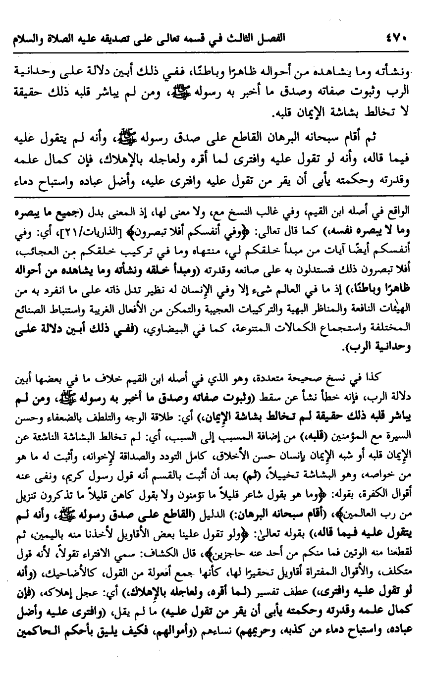 كذا في نسخ صحيحة متعددة، وهو الذي في أصله ابن القيم خلاف ما في بعضها أبين دلالة الرب، فإنه خطأ نشأ عن سقط "وثبوت صفاته وصدق ما أخبر به رسوله صلى الله عليه وسلم، ومن لم يباشر قلبه ذلك حقيقة لم تخالط بشاشة الإيمان"، أي: طلاقة الوجه والتلطف بالضعفاء وحسن السيرة مع المؤمنين "قلبه" من إضافة المسبب إلى السبب، أي: لم تخالط البشاشة الناشئة عن الإيمان قلبه أو شبه الإيمان بإنسان حسن الأخلاق، كامل التودد والصدقة لإخوانه، وأثبت له ما هو من خواصه، وهو البشاشة تخييلًا، "ثم" بعد أن أثبت بالقسم أنه قول رسول كريم، ونفى عنه أقوال الكفرة، بقوله: {وَمَا هُوَ بِقَوْلِ شَاعِرٍ قَلِيلًا مَا تُؤْمِنُونَ، وَلَا بِقَوْلِ كَاهِنٍ قَلِيلًا مَا تَذَكَّرُونَ، تَنْزِيلٌ مِنْ رَبِّ الْعَالَمِينَ} ، "أقام سبحانه البرهان" الدليل "القاطع على صدق رسوله صلى الله عليه وسلم، وأنه لم يتقول عليه فيما قاله"، بقوله تعالى: {وَلَوْ تَقَوَّلَ عَلَيْنَا بَعْضَ الْأَقَاوِيلِ، لَأَخَذْنَا مِنْهُ بِالْيَمِينِ، ثُمَّ لَقَطَعْنَا مِنْهُ الْوَتِينَ، فَمَا مِنْكُمْ مِنْ أَحَدٍ عَنْهُ حَاجِزِينَ} ، قال الكشاف: سمي الإفتراء تقولًا؛ لأنه قول متكلف، والأقوال المفتراة أقاويل تحقيرًا لها، كأنها جمع أفعولة من القول، كالأضاحيك، "وأنه لو تقول عليه وافترى" عطف تفسير "لما أقره، ولعاجله بالإهلاك" أي: عجل إهلاكه، "فإن كمال علمه وقدرته وحكمته يأبى أن يقر من تقول عليه" ما لم يقل، "وافترى عليه وأضل عباده، واستباح دماء من كذبه، وحريمهم" نساءهم "وأموالهم، فكيف يليق بأحكم الحاكمين
