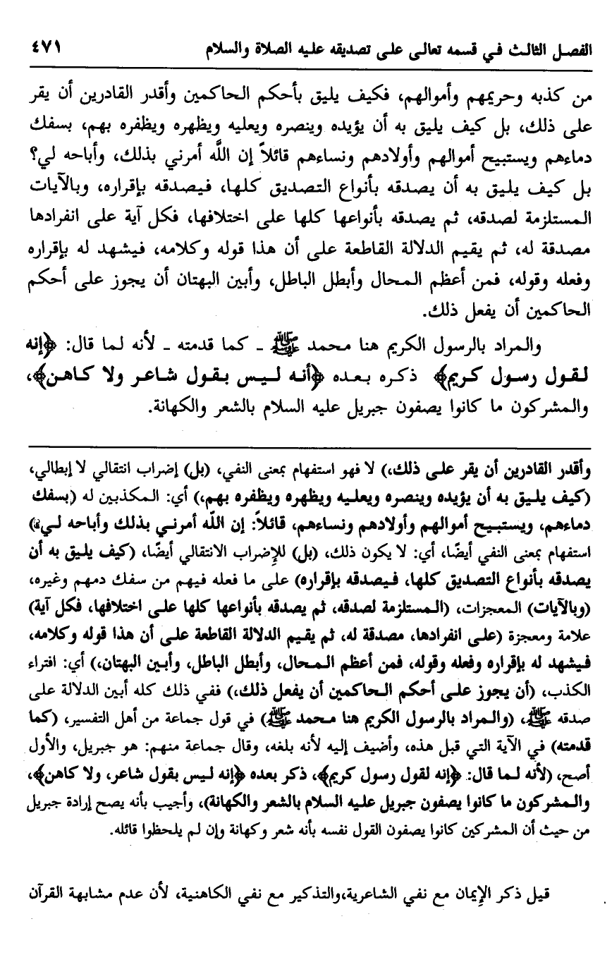 ثم يصدقه بأنواعها كلها على اختلافها، فكل آية" علامة ومعجزة "على انفرادها مصدقة له، ثم يقيم الدلالة القاطعة على أن هذا قوله وكلامه، فيشهد له بإقراره وفعله وقوله، فمن أعظم المحال وأبطل الباطل، وأبين البهتان" أي: افتراء الكذب، "أن يجوز على أحكم الحاكمين أن يفعل ذلك" ففي ذلك كله أبين الدلالة على صدقه صلى الله عليه وسلم، "والمراد بالرسول الكريم هنا محمد صلى الله عليه وسلم" في قول جماعة من أهل التفسير، "كما قدمته" في الآية التي قبل هذه، وأضيف إليه؛ لأنه بلغه، وقال جماعة منهم: هو جبريل، والأول أصح؛ "لأنه لما قال: {إِنَّهُ لَقَوْلُ رَسُولٍ كَرِيم} ذكره بعده "إنه ليس بقول شاعر ولا كاهن" والمشركون ما كانوا يصفون جبريل عليه السلام بالشعر والكهانة، وأجيب بأنه يصح إرادة جبريل من حيث إن المشركين كانوا يصفون القول نفسه بأنه شعر وكهانة وإن لم يلحظوا قائله.