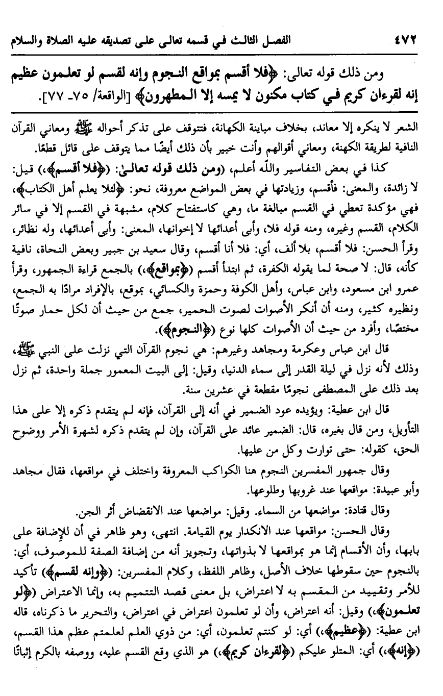 ومن ذلك قوله تعالى: {فَلَا أُقْسِمُ بِمَوَاقِعِ النُّجُومِ، وَإِنَّهُ لَقَسَمٌ لَوْ تَعْلَمُونَ عَظِيمٌ، إِنَّهُ لَقُرْآنٌ كَرِيمٌ، فِي كِتَابٍ مَكْنُونٍ، لَا يَمَسُّهُ إِلَّا الْمُطَهَّرُونَ} [الواقعة: 75-77] .