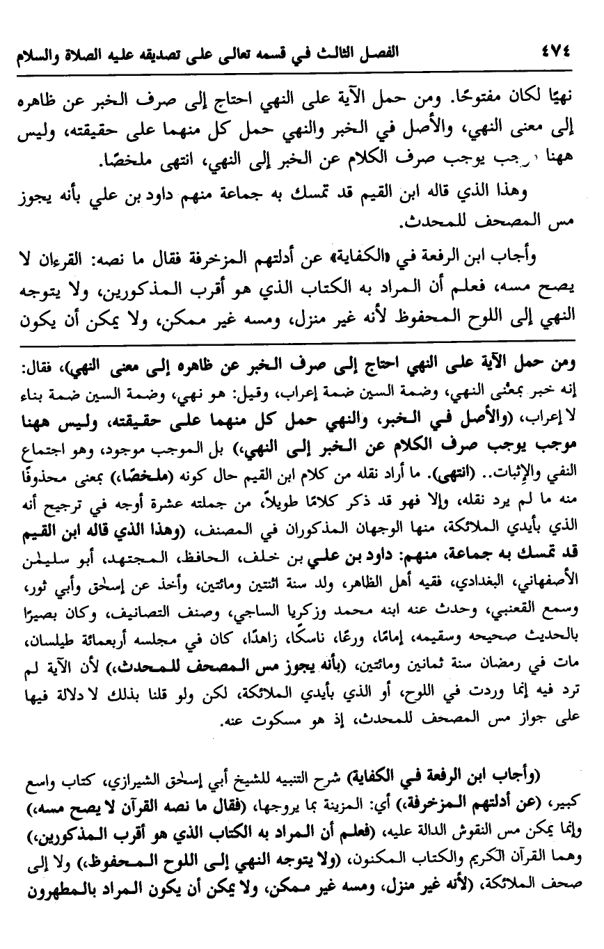 ومن حمل الآية على النهي احتاج إلى صرف الخبر عن ظاهره إلى معنى النهي"، فقال: إنه خبر بمعنى النهي، وضمة السين ضمة إعراب، وقيل: هو نهي، وضمة السين ضمة بناء لا إعراب، "والأصل في الخبر، والنهي حمل كل منهما على حقيقته، وليس ههنا موجب يوجب صرف الكلام عن الخبر إلى النهي" بل الموجب موجود، وهو اجتماع النفي والإثبات. "انتهى" ما أراد نقله من كلام ابن القيم حال كونه "ملخصًا" بمعنى محذوفًا منه ما لم يرد نقله، وإلا فهو قد ذكر كلامًا طويلًا، من جملته عشرة أوجه في ترجيح أنه الذي بأيدي الملائكة، منها الوجهان المذكوران في المصنف، "وهذا الذي قاله ابن القيم قد تمسك به جماعة، منهم: داود بن علي بن خلف، الحافظ، المجتهد، أبو سليمان الأصفهاني، البغدادي، فقيه أهل الظاهر، ولد سنة اثنتين ومائتين، وأخذ عن إسحاق وابي ثور، وسمع القعنبي، وحدث عنه ابنه محمد وزكريا الساجي، وصنف التصانيف، وكان بصيرًا بالحديث صحيحه وسقيمه، إمامًا، ورعا، ناسكًا، زاهدًا، كان في مجلسه أربعمائة طيلسان، مات في رمضان سنة ثمانين ومائتين، "بأنه يجوز من المصحف للمحدث"؛ لأن الآية لم ترد فيه إنما وردت في اللوح، أو الذي بأيدي الملائكة، لكن ولو قلنا بذلك لا دلالة فيها على جواز مس المصحف للمحدث، إذ هو مسكوت عنه.