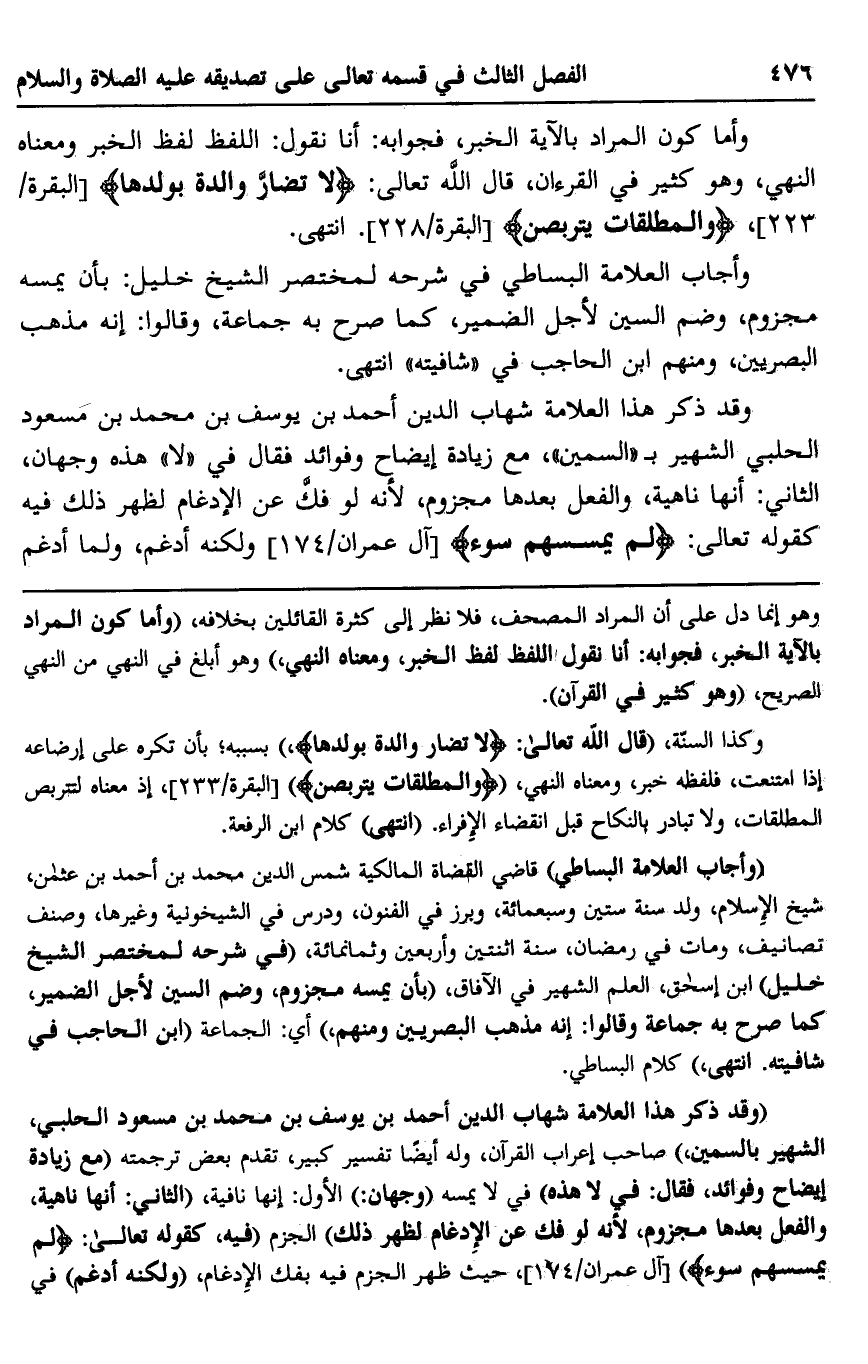 وقد ذكر هذا العلامة شهاب الدين أحمد بن يوسف بن محمد بن مسعود الحلبي الشهير بـ"السمين"، مع زيادة إيضاح وفوائد فقال في "لا" هذه وجهان، الثاني: أنها ناهية، والفعل بعدها مجزوم؛ لأنه لو فك عن الإدغام لظهر ذلك فيه كقوله تعالى: {لَمْ يَمْسَسْهُمْ سُوء} [آل عمران: 174] ولكنه أدغم، ولما أدغم