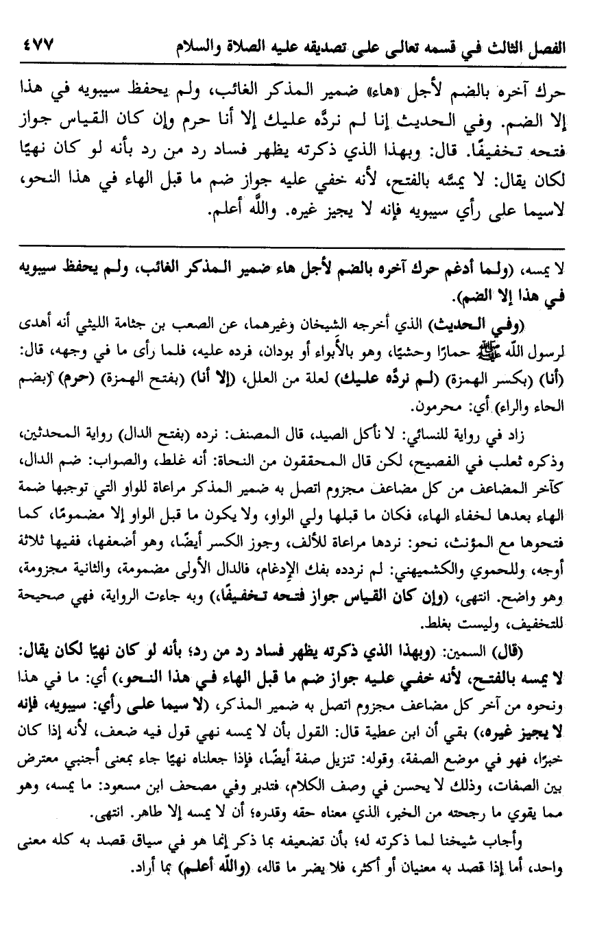 "قال" السمين: "وبهذا الذي ذكرته يظهر فساد رد من رد؛ بأنه لو كان نهيًا لكان يقال: لا يمسه بالفتح؛ لأنه خفي عليه واز ضم ما قبل الهاء في هذا النحو"، أي: ما في هذا ونحوه من آخر كل مضاعف مجزوم اتصل به ضمير المذكر، "لا سيما على رأي: سيبويه، فإنه لا يجيز غيره" بقي أن ابن عطية قال: القول بأن لا يمسه نهي قول فيه ضعف؛ لأنه إذا كان خبرًا، فهو في موضع الصفة، وقوله: تنزيل صفة أيضًا، فإذا جعلناه نهيًا جاء بمعنى أجنبي معترض بين الصفات، وذلك لا يحسن في وصف الكلام، فتدبر وفي مصحف ابن مسعود: ما يمسه وهو مما يقوي ما رجحته من الخبر، الذي معناه حقه وقدره؛ أن لا يمسه إلا طاهر. انتهى.