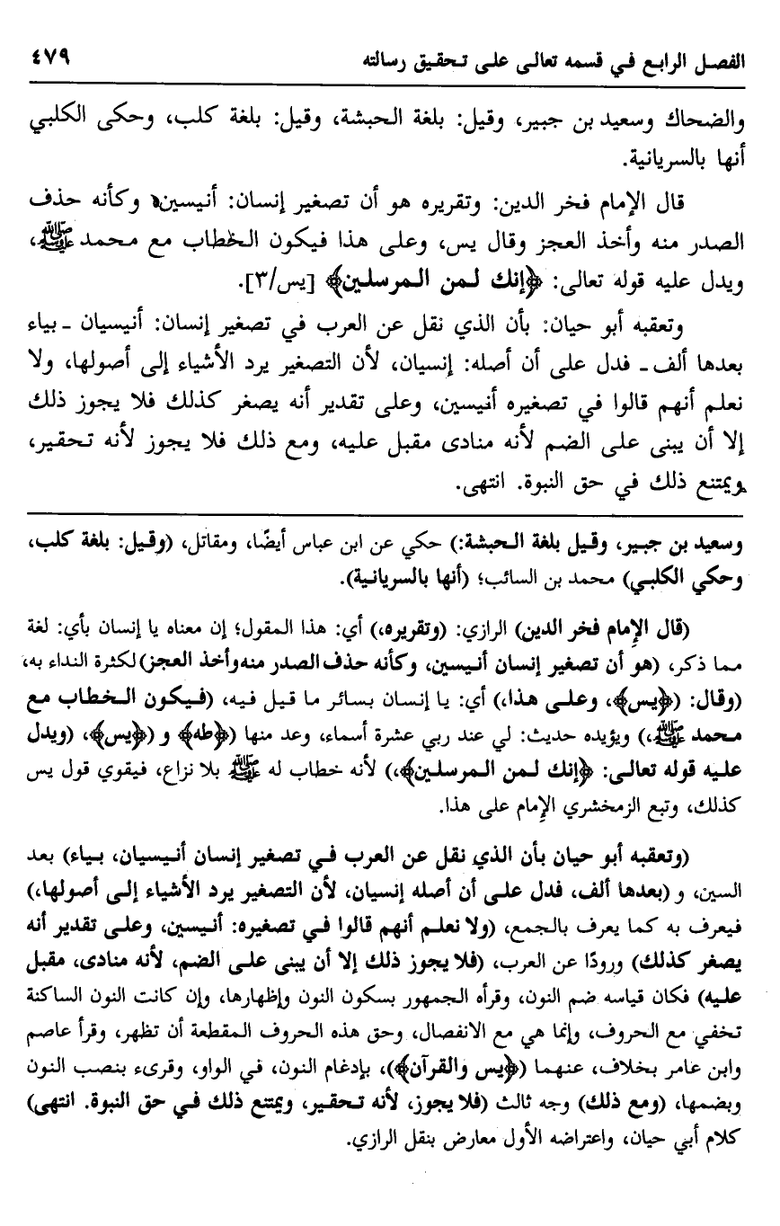 وتعقبه أبو حيان: بأن الذي نقل عن العرب في تصغير إنسان: أنيسيان -بياء بعدها ألف- فدل على أن أصله: إنسيان؛ لأن التصغير يرد الأشياء إلى أصولها، ولا نعلم أنهم قالوا في تصغيره أنيسين، وعلى تقدير أنه يصغر كذلك فلا يجوز ذلك إلا أن يبنى على الضم؛ لأنه منادى مقبل عليه، ومع ذلك فلا يجوز؛ لأنه تحقير، ويمتنع ذلك في حق النبوة. انتهى.