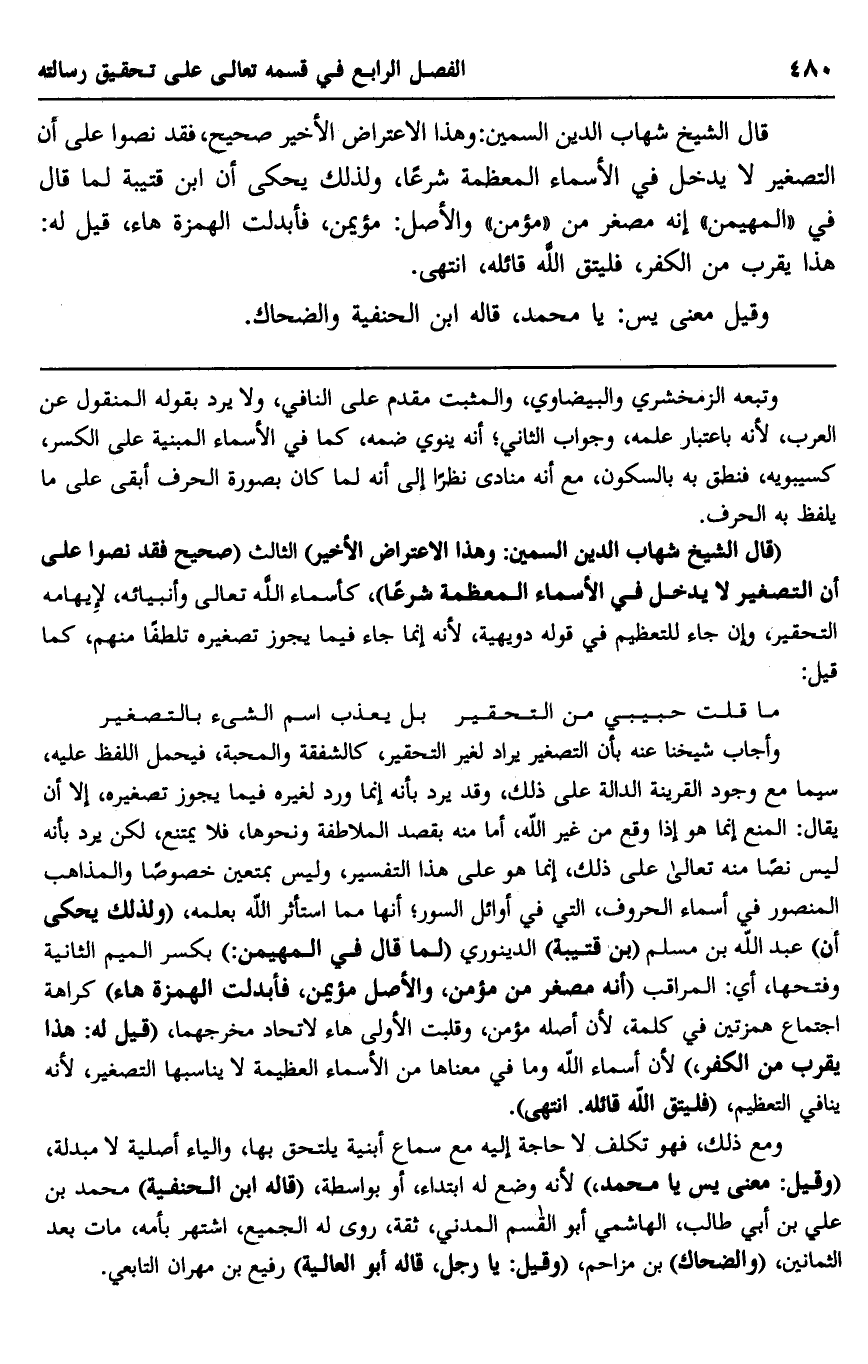 قال الشيخ شهاب الدين السمين: وهذا الاعتراض الأخير صحيح، فقد نصوا على أن التصغير لا يدخل في الأسماء المعظمة شرعًا، ولذلك يحكى أن ابن قتيبة لما قال في "المهيمن" إنه مصغر من "مؤمن" والأصل: مؤيمن، فأبدلت الهمزة هاء، قيل له: هذا يقرب من الكفر، فليتق الله قائله، انتهى.