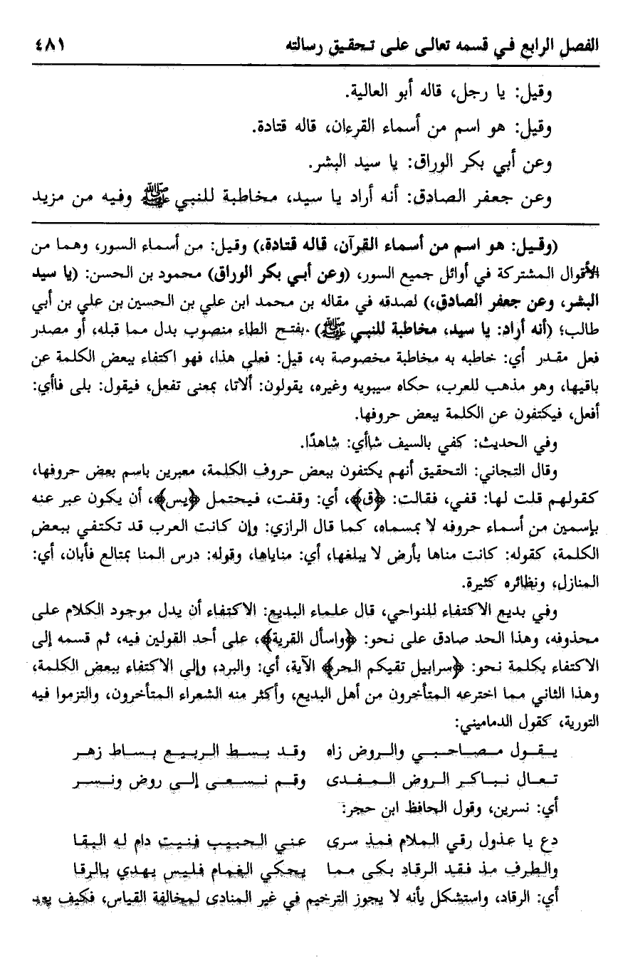 وقال التجاني: التحقيق أنهم يكتفون ببعض حروف الكلمة، معبرين باسم بعض حروفها، كقولهم قلت لها: قفي، فقالت: {ق} ، أي: وقفت، فيحتمل {يس} ، أن يكون عبر عنه بإسمين من أسماء حروفه لا بمسماه، كما قال الرازي: وإن كانت العرب قد تكتفي ببعض الكلمة، كقوله: كانت مناها بأرض لا يبلغها، أي: مناياها، وقوله: درس المنا بمتالع فأبان، أي: المنازل، ونظائره كثيرة.