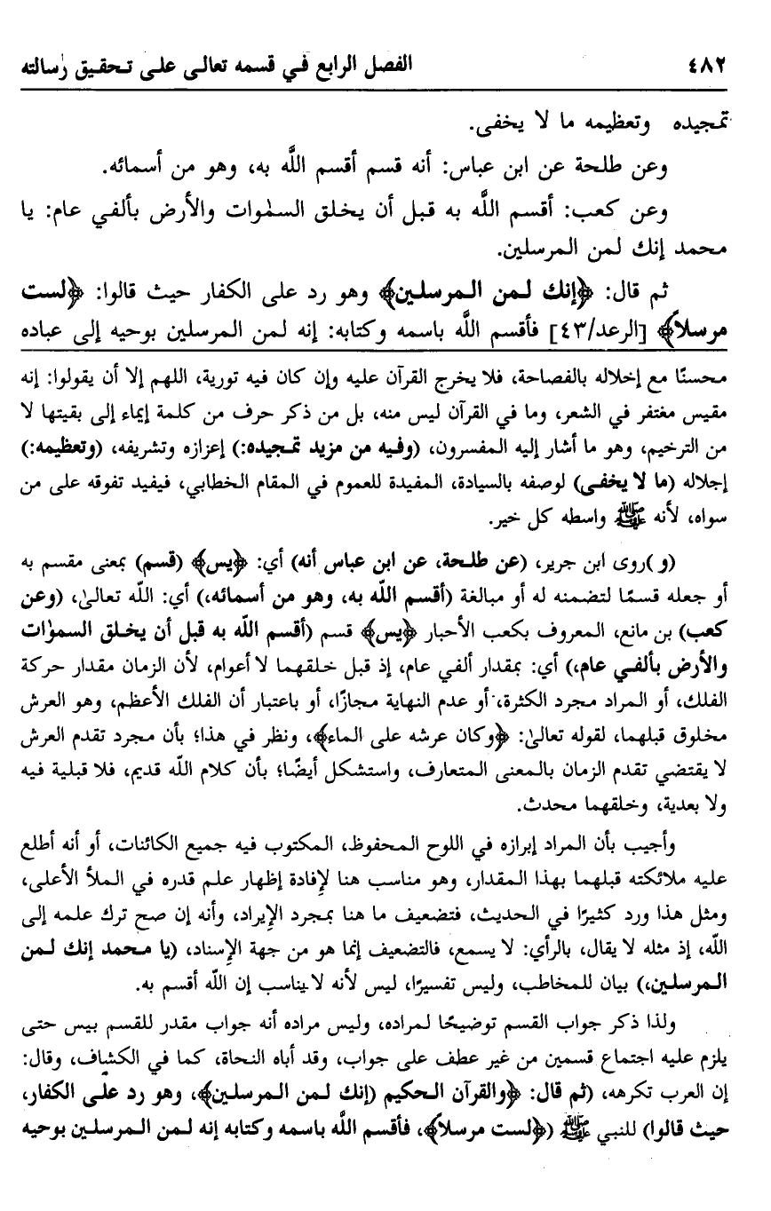 وعن كعب: أقسم الله به قبل أن يخلق السماوات والأرض بألفي عام: يا محمد إنك لمن المرسلين.