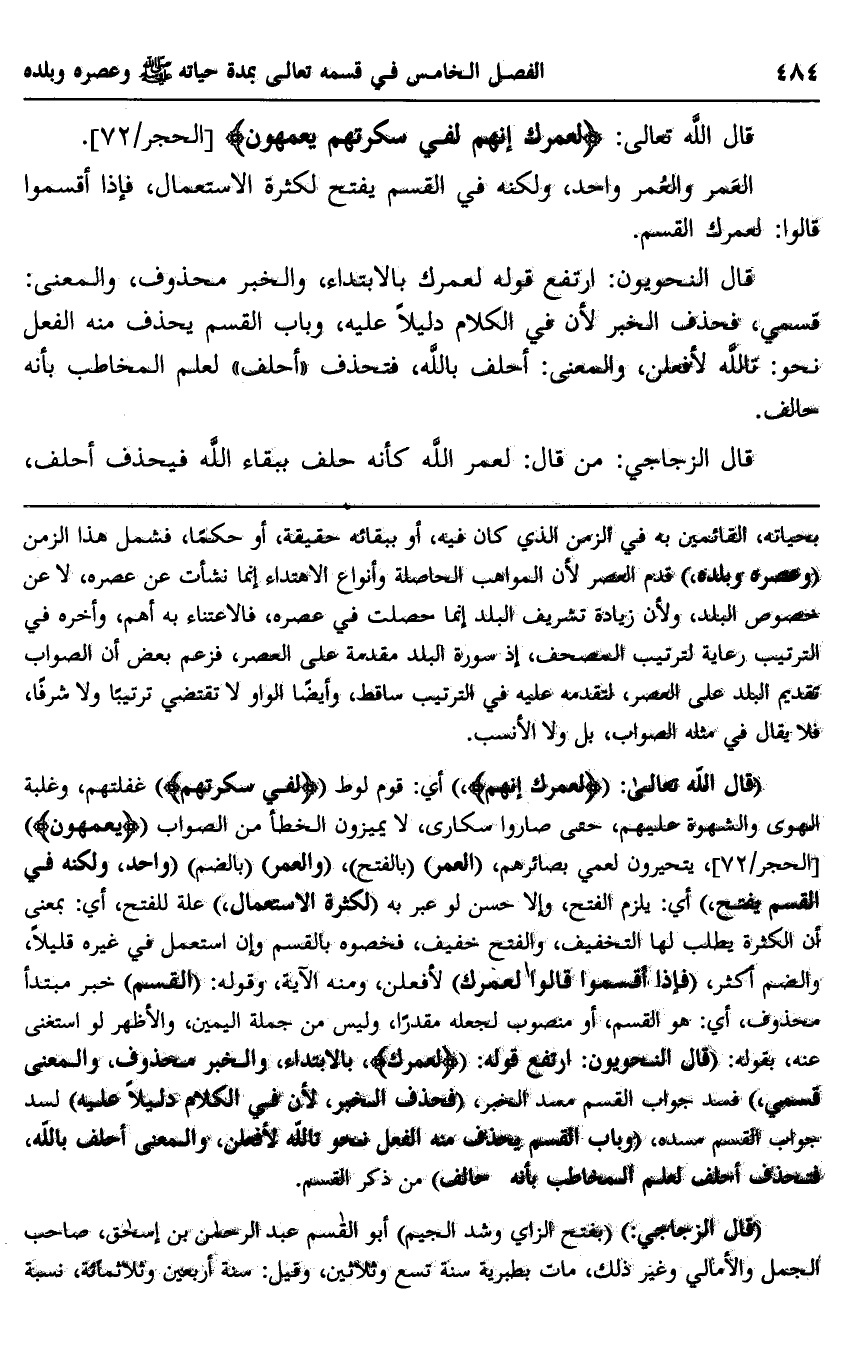 "قال الله تعالى: " {لَعَمْرُكَ إِنَّهُمْ} " أي: قوم لوط " {لَفِي سَكْرَتِهِمْ} " غفلتهم، وغلبة الهوى والشهوة عليهم، حتى صاروا سكارى، لا يميزون الخطأ من الصواب " {يَعْمَهُون} " [الحجر: 72] ، يتحيرون لعمي بصائرهم، "العمر" بالفتح"، "والعمر" "بالضم" واحد، ولكنه في القسم يفتح" أي: يلزم الفتح، وإلا حسن لو عبر به "لكثرة الاستعمال" علة للفتح، أي: بمعنى أن الكثرة يطلب لها التخفيف، والفتح خفيف، فخصوه بالقسم وإن استعمل في غيره قليلًا، والضم أكثر، "فإذا أقسموا قالوا لعمرك" لأفعلن، ومنه الآية، وقوله: "القسم" خبر مبتدأ محذوف، أي: هو القسم، أو منصوب لجعله مقدرًا، وليس من جملة اليمين، والأظهر لو استغنى عنه، بقوله: "قال النحويون: ارتفع قوله: {لَعَمْرُكَ} ، بالابتداء، والخبر محذوف، والمعنى قسمي" فسد جواب القسم مسد الخبر، "فحذف الخبر؛ لأن في الكلام دليلًا عليه" لسد جواب القسم مسده، "وباب القسم يحذف منه الفعل نحو تالله لأفعلن، والمعنى أحلف بالله، فتحذف أحلف لعلم المخاطب" بأنه حالف" من ذكر القسم.