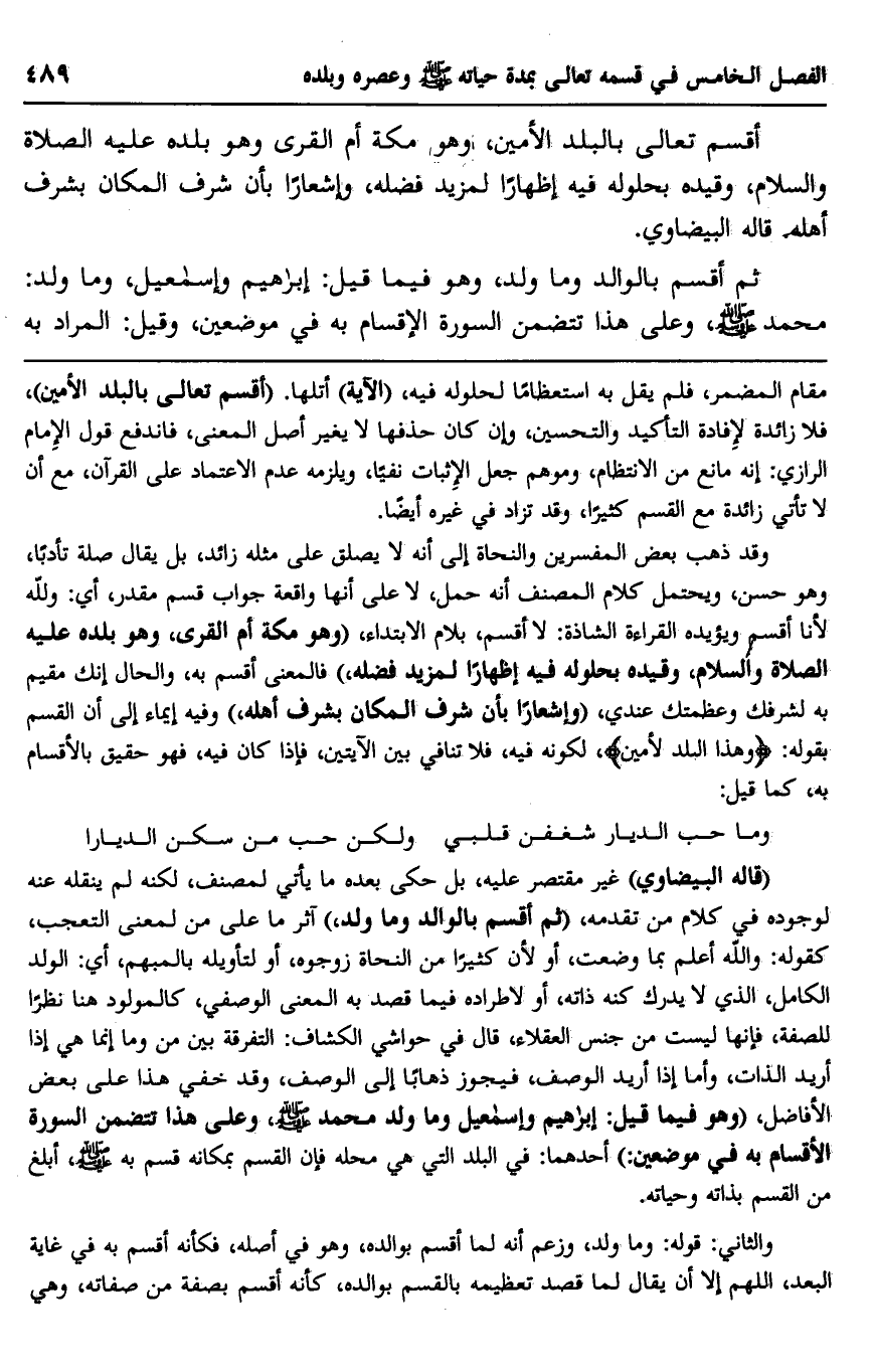 "قاله البيضاوي" غير مقتصر عليه، بل حكى بعده ما يأتي لمصنف، لكنه لم ينقله عنه لوجوده في كلام من تقدمه "ثم أقسم بالوالد وما ولد" آثر ما على من لمعنى التعجب، كقوله: والله أعلم بما وضعت، أو؛ لأن كثيرا منالنحاة زوجوه، أو لتأويله بالمبهم، أي: الولد الكامل، الذي لا يدرك كنه ذاته، أو لاطراده فيما قصد به المعنى الوصفي، كالمولود هنا نظرا للصفة، فإنها ليست منجنس العقلاء، قال في حواشي الكشاف: التفرقة بين من وما إنما هي إذا أريد الذات، وأما إذا أريد الوصف، فيجوز ذهابا إلى الوصف، وقد خفي هذا على بعض الأفاضل، "وهو فيما قيل: إبراهيم وإسماعيل وما ولد محمد صلى الله عليه وسلم، وعلى هذا تتضمن السورة الأقسام به في موضعين" أحدهما: في البلد التي هي محله فإذا القسم بمكانه قسم به صلى الله عليه وسلم، أبلغ من القسم بذاته وحياته.