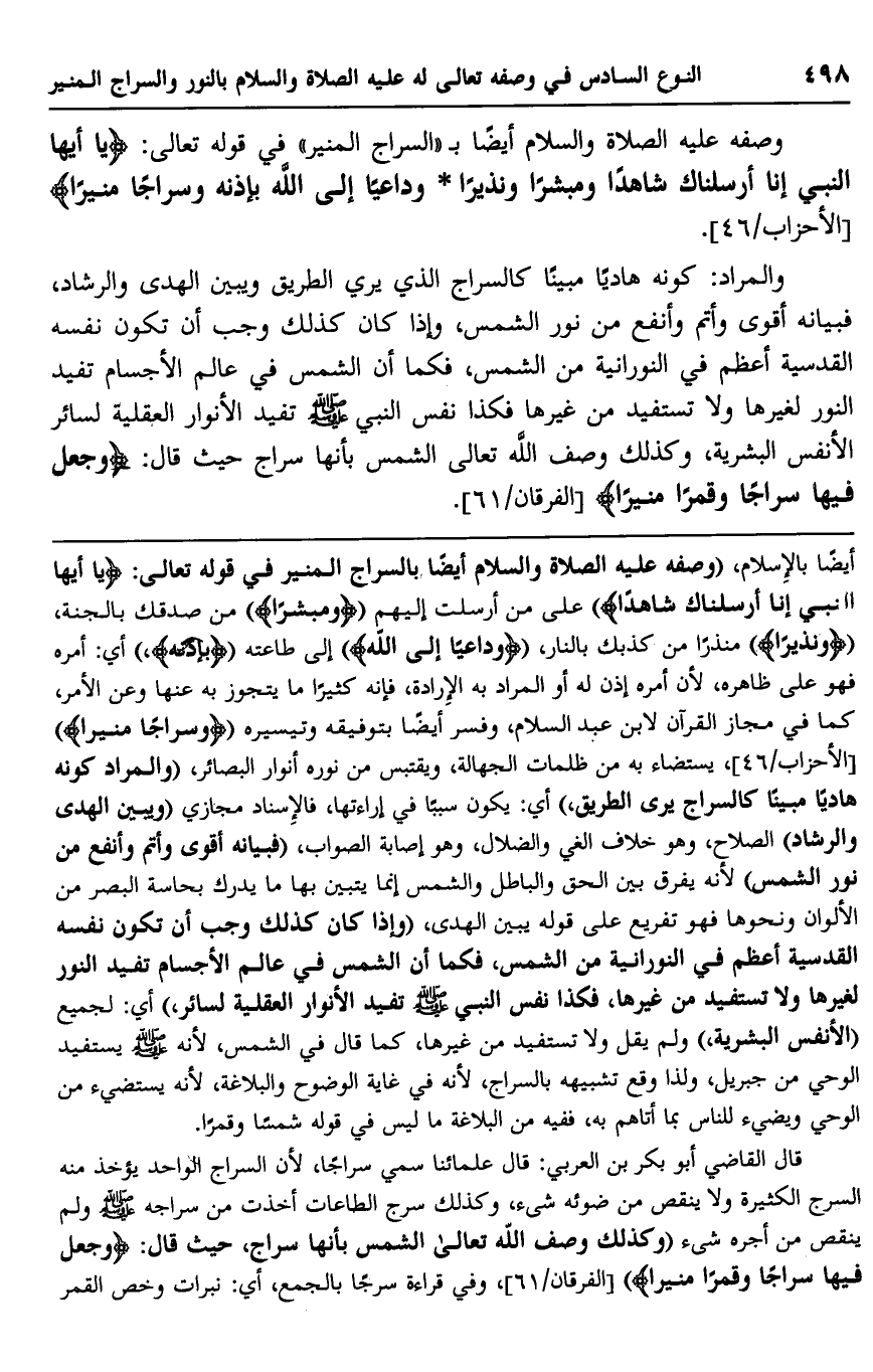 أيضًا بالإسلام، "وصفه عليه الصلاة والسلام أيضًا بالسراج المنير في قوله تعالى: {يَا أَيُّهَا النَّبِيُّ إِنَّا أَرْسَلْنَاكَ شَاهِدًا} على من أرسلت إليهم " {وَمُبَشِّرًا} " من صدقك بالجنة، " {وَنَذِيرًا} " منذرًا من كذبك بالنار، " {وَدَاعِيًا إِلَى اللَّهِ} " إلى طاعته " {بِإِذْنِهِ} " أي: أمره فهو على ظاهره؛ لأن أمره إذن له أو المراد به الإرادة، فإنه كثيرًا ما يتجاوز به عنها وعن الأمر، كما في مجاز القرآن لابن عبد السلام، وفسر أيضًا بتوفيقه وتيسيره، " {وَسِرَاجًا مُنِيرًا} " [الأحزاب: 46] ، يستضاء به من ظلمات الجهالة، ويقتبس من نوره أنوار البصائر، "والمراد كونه هاديًا مبينًا كالسراج يرى الطريق"، أي: يكون سببًا في إراءتها، فالإسناد مجازي "ويبين الهدى والرشاد" الصلاح، وهو خلاف الغي والضلال، وهو إصابة الصواب، "فبيانه أقوى وأتم وأنفع من نور الشمس"؛ لأنه يفرق بين الحق والباطل والشمس إنما يتبين بها ما يدرك بحاسة البصر من الألوان ونحوها فهو تفريع على قوله يبين الهدى، "وإذا كان كذلك وجب أن تكون نفسه القدسية أعظم في النورانية من الشمس، فكما أن الشمس في عالم الأجسام تفيد النور لغيرها ولا تستفيد من غيرها، فكذا. نفس النبي صلى الله عليه وسلم تفيد الأنوار العقلية لسائر" أي: لجميع "الأنفس البشرية" ولم يقل ولا تستفيد من غيرها، كما قال في الشمس؛ لأنه صلى الله عليه وسلم يستفيد الوحي من جبريل، ولذا وقع تشبيهه بالسراج؛ لأنه في غاية الوضوح والبلاغة؛ لأنه يستضيء من الوحي ويضيء للناس بما أتاهم به، ففيه من البلاغة ما ليس في قوله: شسمًا وقمرًا.