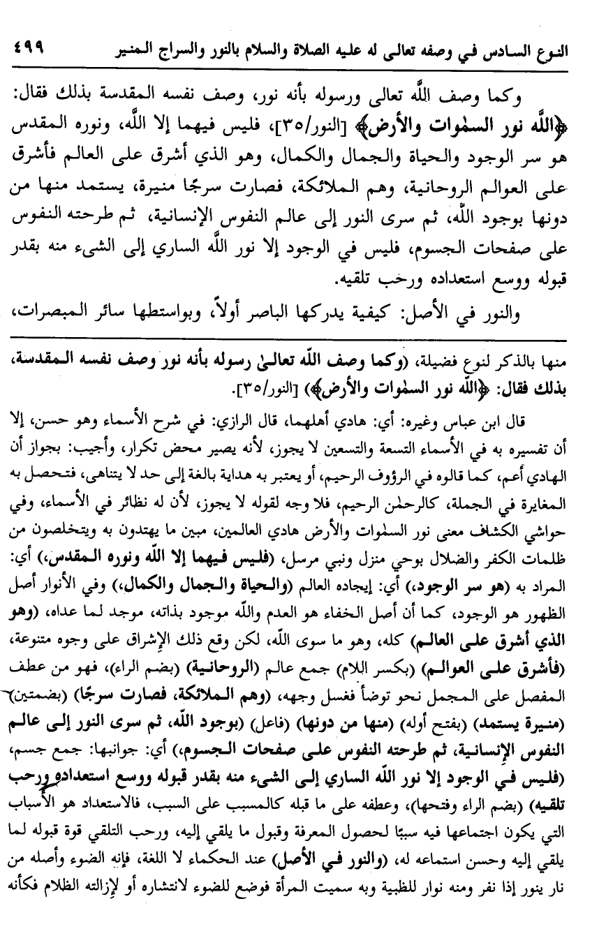 وكما وصف الله تعالى ورسوله بأنه نور، وصف نفسه المقدسة بذلك فقال: {اللَّهُ نُورُ السَّمَاوَاتِ وَالْأَرْض} [النور: 35] ، فليس فيهما إلا الله، ونوره المقدس هو سر الوجود والحياة والجمال والكمال، وهو الذي أشرق على العالم فأشرق على العوالم الروحانية، وهم الملائكة، فصارت سرجًا منيرة، يستمد منها من دونها بوجود الله، ثم سرى النور إلى عالم النفوس الإنسانية، ثم طرحته النفوس على صفحات الجسوم، فليس في الوجود إلا نور الله الساري إلى الشيء منه بقدر قبوله ووسع استعداده ورحب تلقيه.