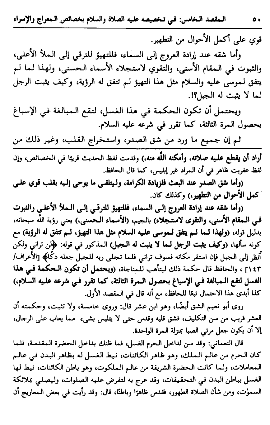 قال النعماني: وقد سن لداخل الحرم الغسل، فما ظنك بداخل الحضرة المقدسة، فلما كان الحرم من عالم الملك، وهو ظاهر الكائنات نيط الغسل له بظاهر البدن في عالم المعاملات، ولما كانت الحضرة الشريفة من عالم الملكوت، وهو باطن الكائنات، نيط لها الغسل بباطن البدن في التحقيقات، وقد عرج به لتفرض عليه الصلوات، وليصلي بملائكة السماوات، ومن شأن الصلاة الطهور، فقدس ظاهرًا وباطنًا قال: وقد رأيت في بعض المعاريج أن