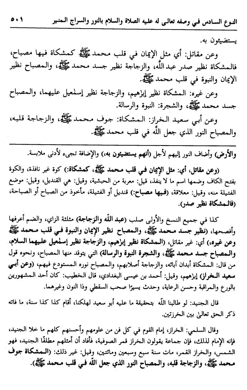 وقال السلمي: الخراز، إمام القوم في كل فن من علومهم وأحسنهم كلهم ما خلا الجنيد، فإنه الإمام لذلك، فإن جماعة يقولون الخراز قمر الصوفية، فأفاد أن أمثلهم مطلقًا الجنيد، فهو الشمس، والخراز القمر، مات سنة سبع وسبعين ومائتين، وقيل: غير ذلك: "المشكاة جوف محمد صلى الله عليه وسلم، والزجاجة قلبه، والمصباح النور الذي جعل الله في قلب محمد صلى الله عليه وسلم".