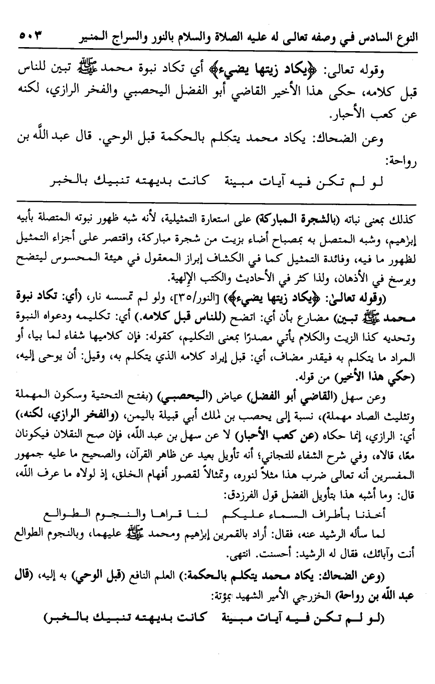 وقوله تعالى: {يَكَادُ زَيْتُهَا يُضِيءُ} أي تكاد نبوة محمد صلى الله عليه وسلم تبين للناس قبل كلامه، حكى هذا الأخير القاضي أبو الفضل اليحصبي والفخر الرازي، لكنه عن كعب الأحبار.