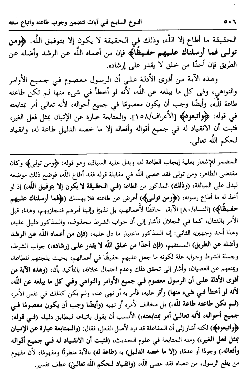 وهذه الآية من أقوى الأدلة على أن الرسول معصوم في جميع الأوامر والنواهي، وفي كل ما يبلغه عن الله؛ لأنه لو أخطأ في شيء منها لم تكن طاعته طاعة لله، وأيضًا وجب أن يكون معصومًا في جميع أحواله؛ لأنه تعالى أمر بمتابعته في قوله: {وَاتَّبِعُوه} [الأعراف: 158] . والمتابعة عبارة عن الإتيان بمثل فعل الغير، فثبت أن الانقياد له في جميع أقواله وأفعاله إلا ما خصه الدليل طاعة له, وانقياد لحكم الله تعالى.