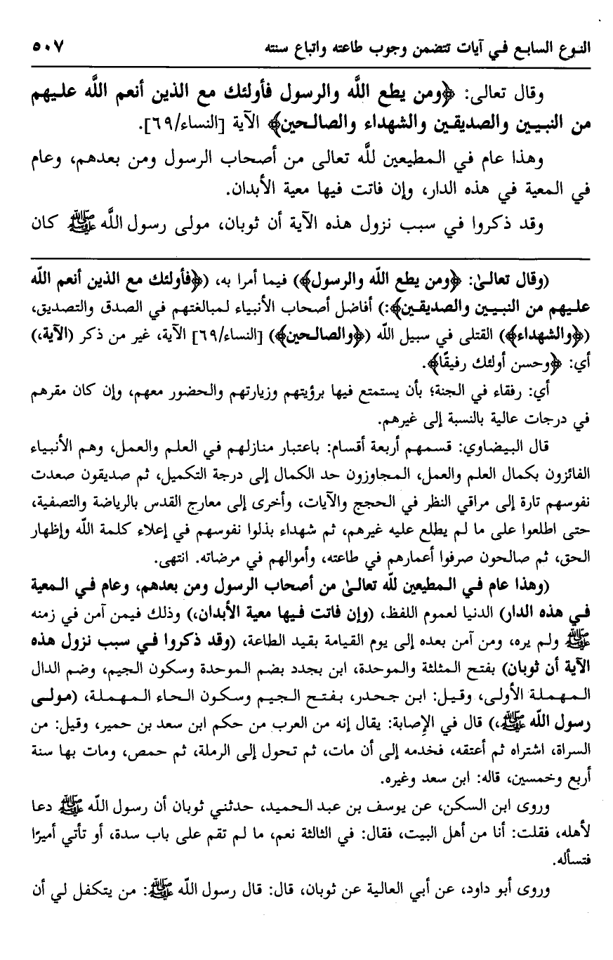 "وقال تعالى: {وَمَنْ يُطِعِ اللَّهَ وَالرَّسُولَ} فيما أمرا به، {فَأُولَئِكَ مَعَ الَّذِينَ أَنْعَمَ اللَّهُ عَلَيْهِمْ مِنَ النَّبِيِّينَ وَالصِّدِّيقِينَ} أفاضل أصحاب الأنبياء لمبالغتهم في الصدق والتصديق " {وَالشُّهَدَاءِ} القتلى في سبيل الله " {وَالصَّالِحِينَ} " [النساء: 69] الآية، غير من ذكر "الآية" أي: {وَحَسُنَ أُولَئِكَ رَفِيقًا} .