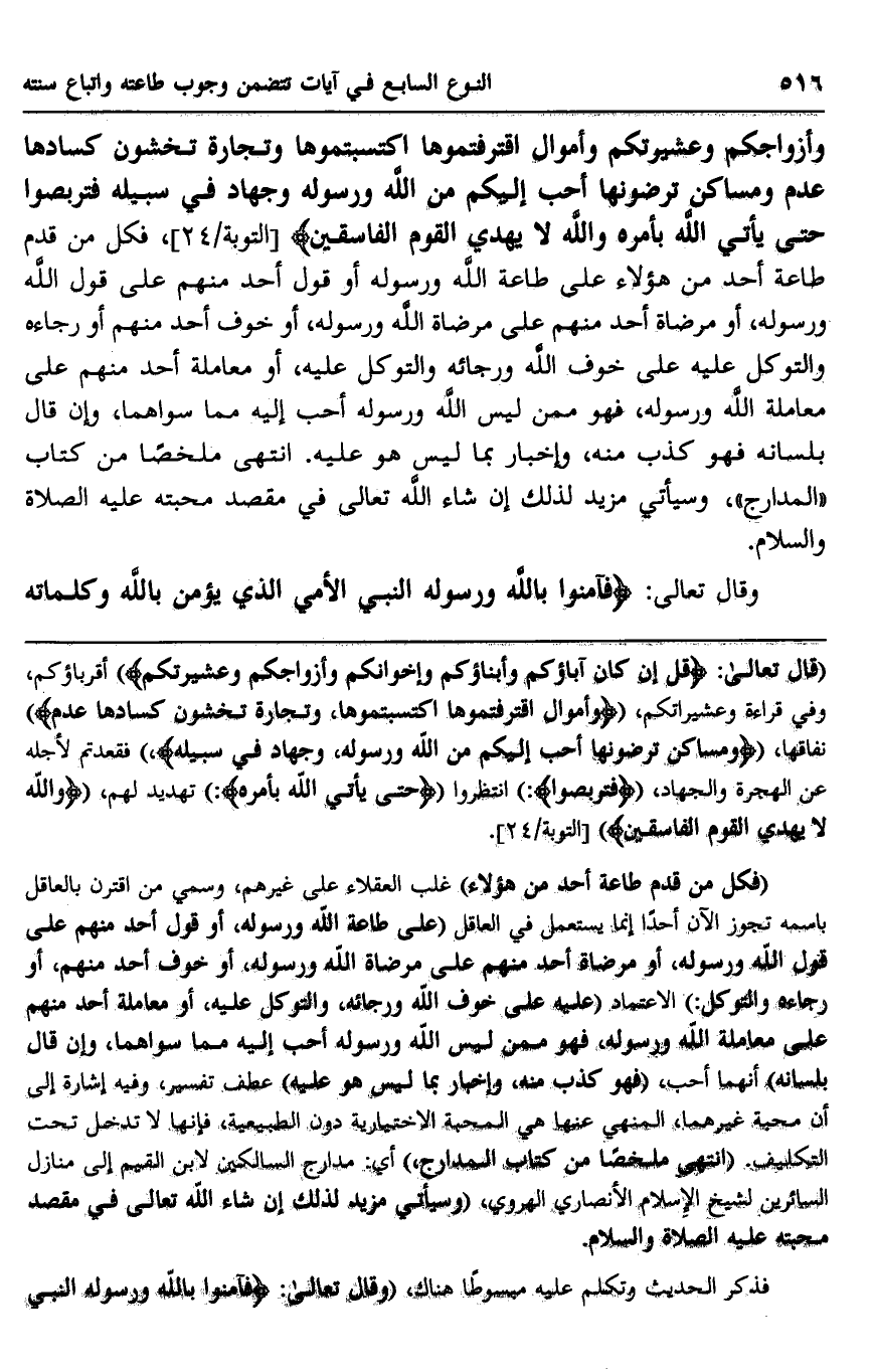 وَأَزْوَاجُكُمْ وَعَشِيرَتُكُمْ وَأَمْوَالٌ اقْتَرَفْتُمُوهَا وَتِجَارَةٌ تَخْشَوْنَ كَسَادَهَا وَمَسَاكِنُ تَرْضَوْنَهَا أَحَبَّ إِلَيْكُمْ مِنَ اللَّهِ وَرَسُولِهِ وَجِهَادٍ فِي سَبِيلِهِ فَتَرَبَّصُوا حَتَّى يَأْتِيَ اللَّهُ بِأَمْرِهِ وَاللَّهُ لَا يَهْدِي الْقَوْمَ الْفَاسِقِينَ} [التوبة: 24] ، فكل من قدم طاعة أحد من هؤلاء على طاعة الله ورسوله أو قول أحد منهم على قول الله ورسوله، أو مرضاة أحد منهم على مرضاة الله ورسوله، أو خوف أحد منهم أو رجاءه والتوكل عليه على خوف الله ورجائه والتوكل عليه، أو معاملة احد منهم على معاملة الله ورسوله، فهو ممن ليس الله ورسوله أحب إليه مما سواهما، وإن قال بلسانه فهو كذب منه، وإخبار بما ليس هو عليه. انتهى ملخصًا من كتاب "المدارج"، وسيأتي مزيد لذلك إن شاء الله تعالى في مقصد محبته عليه الصلاة والسلام.