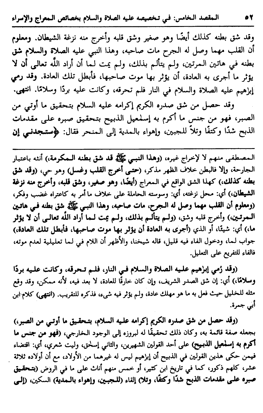 وقد شق بطنه كذلك أيضًا وهو صغير وشق قلبه وأخرج منه نزغة الشيطان، ومعلوم أن القلب مهما وصل له الجرح مات صاحبه، وهذا النبي عليه الصلاة والسلام شق بطنه في هاتين المرتين، ولم يتألم بذلك، ولم يمت لما أن أراد الله تعالى أن لا يؤثر ما أجرى به العادة، أن يؤثر بها موت صاحبها، فأبطل تلك العادة، وقد رمي إبراهيم عليه الصلاة والسلام في النار فلم تحرقه، وكانت عليه بردًا وسلامًا. انتهى.