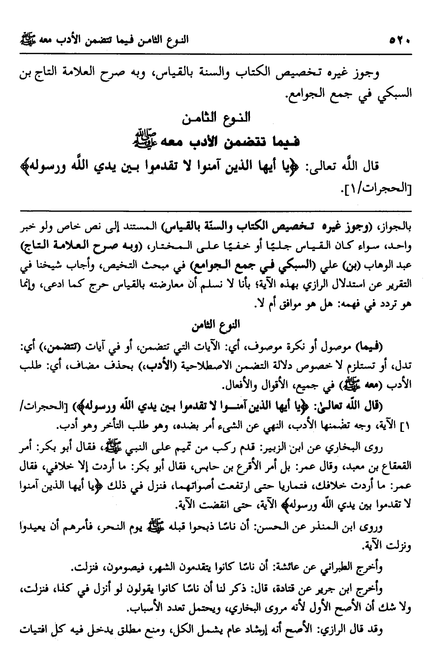 "قال الله تعالى: {يَا أَيُّهَا الَّذِينَ آمَنُوا لَا تُقَدِّمُوا بَيْنَ يَدَيِ اللَّهِ وَرَسُولِهِ} [الحجرات: 1] الآية، وجه تضمنها الأدب، النهي عن الشيء أمر بضده، وهو طلب التأخر وهو أدب.