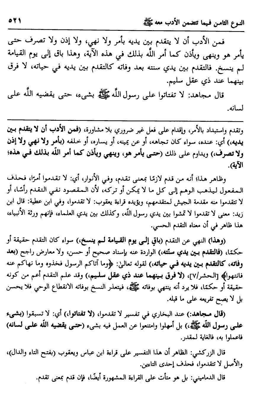وتقدم واستبداد بالأمر، وإقدام على فعل غير ضروري بلا مشاورة، "فمن الأدب أن لا يتقدم بين يديه" أي: عنده، سواء كان تجاهه، أو عن يمينه، أو يساره أو خلفه "بأمر ولا نهي ولا إذن ولا تصرف"، ويداوم على ذلك "حتى يأمر هو، وينهى ويأذن كما أمر الله بذلك في هذه الآية".