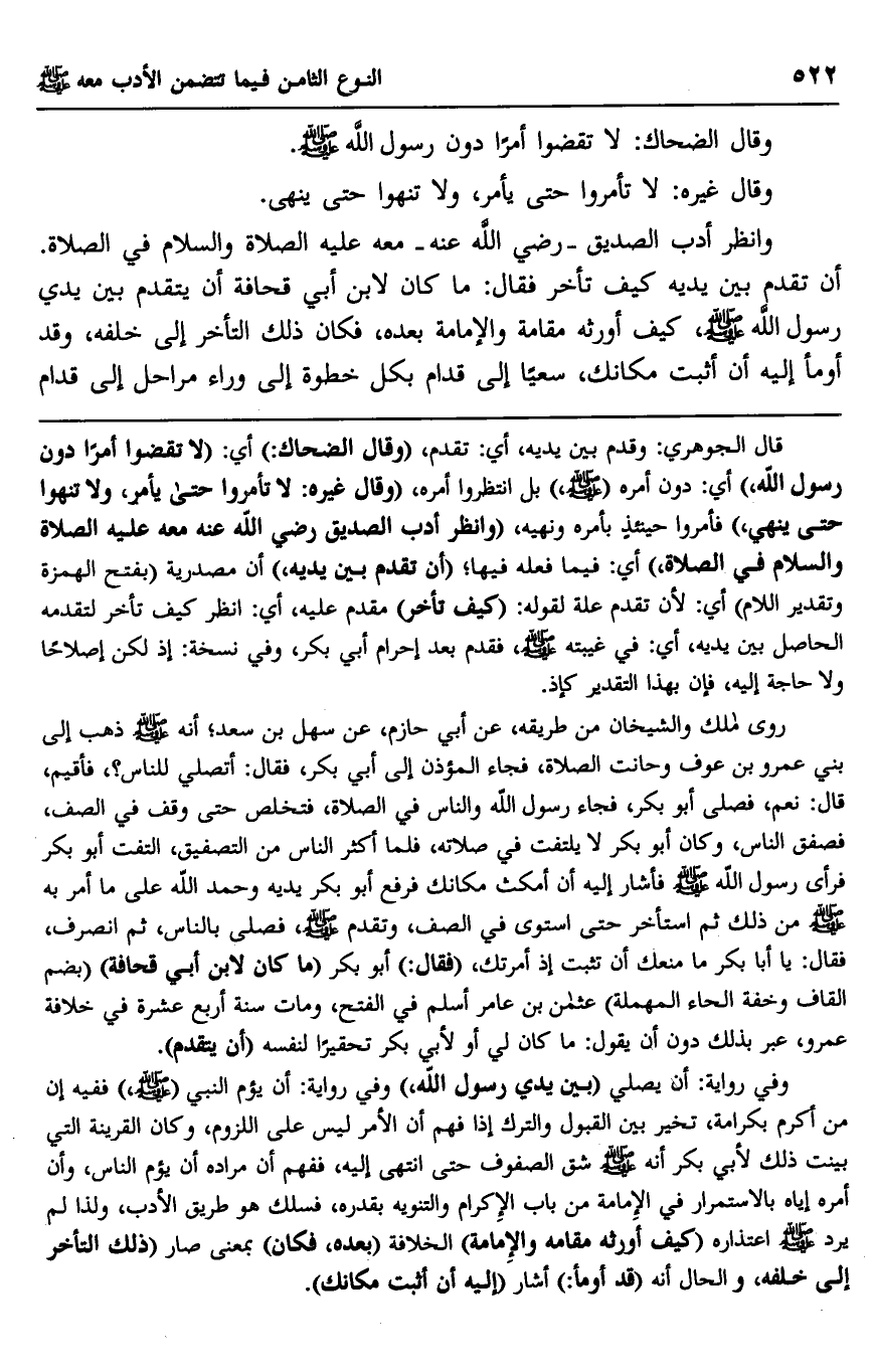 قال الجوهري: وقدم بين يديه، أي: تقدم، "وقال الضحاك" أي: "لا تقضوا أمرا دون رسول الله" أي: دون أمره "صلى الله عليه وسلم" بل انتظروا أمره، "وقال غيره: لا تأمروا حتى يأمر، ولا تنهوا حتى ينهى" فأمروا حينئذ بأمره ونهيه، "وانظر أدب الصديق رضي الله عنه معه عليه الصلاة والسلام في الصلاة" أي: فيما فعله فيها؛ "أن تقدم بين يديه" أن مصدرية "بفتح الهمزة وتقدير اللام" أي: لأن تقدم علة لقوله: "كيف تأخر" مقدم عليه، أي: انظر كيف تأخر لتقدمه الحاصل بين يديه، أي: في غيبته صلى الله عليه وسلم، فقدم بعد إحرام أبي بكر، وفي نسخة: إذ لكن إصلاحًا ولا حاجة إليه، فإن بهذا التقدير كإذ.