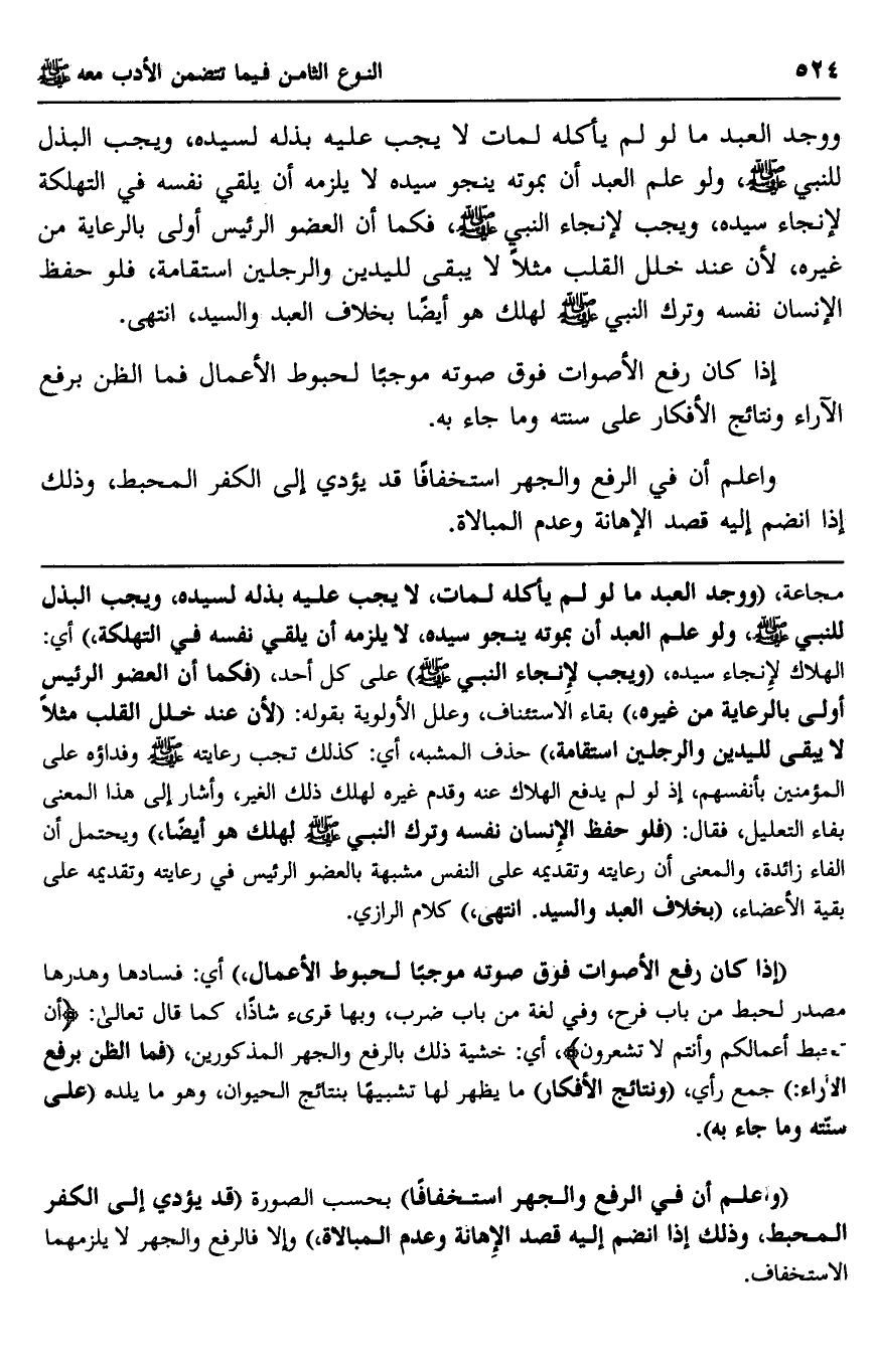 "واعلم أن في الرفع والجهر استخفافًا" بحسب الصورة "قد يؤدي إلى الكفر المحبط، وذلك إذا انضم إليه قصد الإهانة وعدم المبالاة"، وإلا فالرفع والجهر لا يلزمهما الاستخفاف.