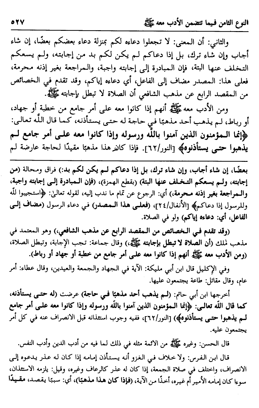 ومن الأدب معه صلى الله عليه وسلم أنهم إذا كانوا معه على أمر جامع من خطبة أو جهاد، أو رباط، لم يذهب أحد مذهبًا في حاجة له حتى يستأذنه، كما قال الله تعالى: {إِنَّمَا الْمُؤْمِنُونَ الَّذِينَ آمَنُوا بِاللَّهِ وَرَسُولِهِ وَإِذَا كَانُوا مَعَهُ عَلَى أَمْرٍ جَامِعٍ لَمْ يَذْهَبُوا حَتَّى يَسْتَأْذِنُوهُ} [النور: 62] . فإذا كان هذا مذهبًا مقيدًا لحاجة عارضة لم