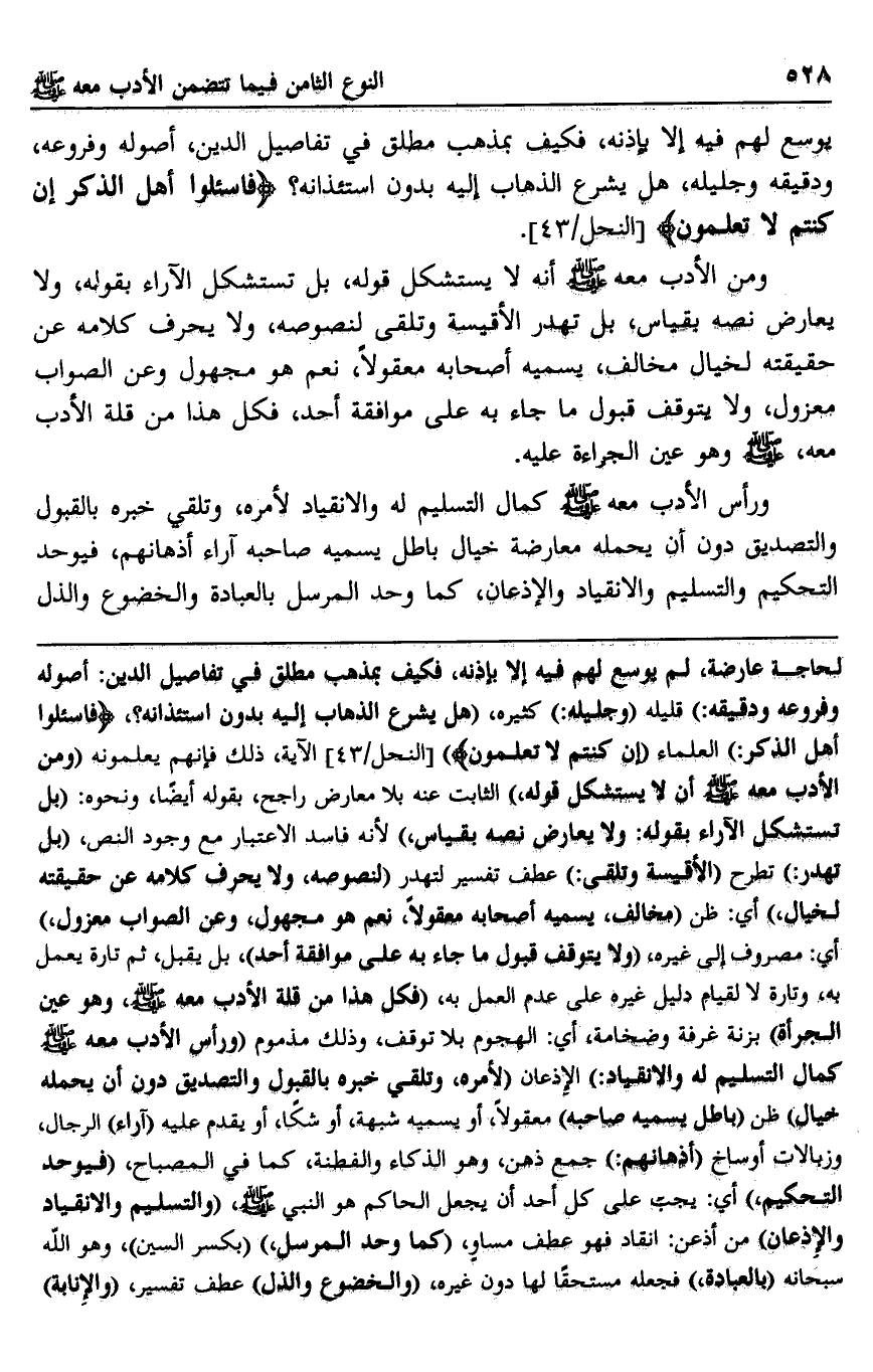 لحاجة عارضة، لم يوسع لهم فيه إلا بإذنه، فكيف بمذهب مطلق في تفاصيل الدين: أصوله وفروعه ودقيقه": قليله "وجليله" كثيره، "هل يشرع الذهاب إليه بدون استئذانه؟، {فَاسْأَلُوا أَهْلَ الذِّكْرِ} العلماء {إِنْ كُنْتُمْ لَا تَعْلَمُونَ} [النحل: 43] الآية، ذلك فإنهم يعلمونه "ومن الأدب معه صلى الله عليه وسلم أن لا يستشكل قوله"، الثابت عنه بلا معارض راجح، بقوله أيضًا، ونحوه: "بل تستشكل الآراء بقوله: ولا يعارض نصه بقياس"؛ لأه فاسد الاعتبار مع وجود النص، "بل تهدر": تطرح "الأقيسة وتلقى": عطف تفسير لتهدر "لنصوصه، ولا يحرف كلامه عن حقيقته لخيال" أي: ظن "مخالف، يسميه أصحابه معقولًا، نعم هو مجهول، وعن الصواب معزول"، أي: مصروف إلى غيره، "ولا يتوقف قبول ما جاء به على موافقة أحد"، بل يقبل، ثم تارة يعمل به، وتارة لا لقيام دليل غيره على عدم العمل به، "فكل هذا من قلة الأدب معه صلى الله عليه وسلم، وهو عين الجرأة" بزنة غرفة وضخامة، أي: الهجوم بلا توقف، وذلك مذموم "ورأس الأدب معه صلى الله عليه وسلم كمال التسليم له والانقياد": الإذعان "لأمره، وتلقى خبره بالقبول والتصديق دون أن يحمله خيال" ظن" "باطل يسميه صاحبه" معقولًا، أو يسميه شبهة، أو شكا، أو يقدم عليه "آراء" الرجال، "وزبالات أوساخ "أذهانهم": جمع ذهن، وهو الذكاء والفطنة، كما في المصباح، "فيوجد التحكيم"، أي: يجب على كل أحد أن يجعل الحاكم هو النبي صلى الله عليه وسلم، "والتسليم والانقياد والإذعان" من أذعن: انقاد فهو عطف مساوٍ، "كما وحد المرسل" "بكسر السين"، وهو الله سبحانه "بالعبادة"، فجعله مستحقا لها دون غيره، "والخضوع والذل" عطف تفسير، "والإنابة"