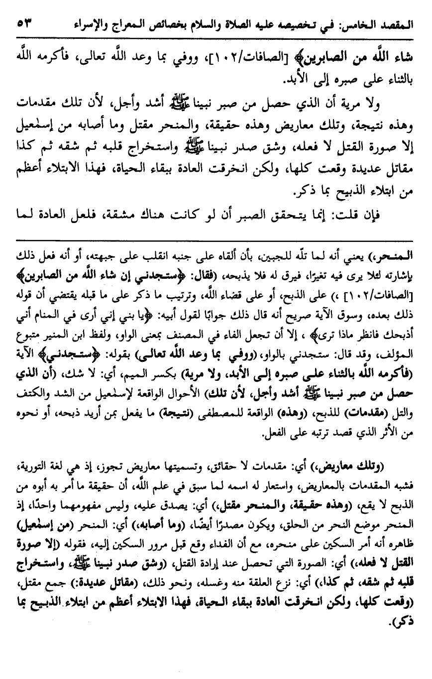 ولا مرية أن الذي حصل من صبر نبينا -صلى الله عليه وسلم- أشد وأجل؛ لأن تلك مقدمات وهذه نتيجة، وتلك معاريض وهذه حقيقة، والمنحر مقتل وما أصابه من إسماعيل إلا صورة القتل لا فعله، وشق صدر نبينا -صلى الله عليه وسلم- واستخراج قلبه، ثم شقه ثم كذا مقاتل عديدة وقعت كلها، ولكن انخرقت العادة ببقاء الحياة، فهذا الابتلاء أعظم من ابتلاء الذبيح بما ذكر.