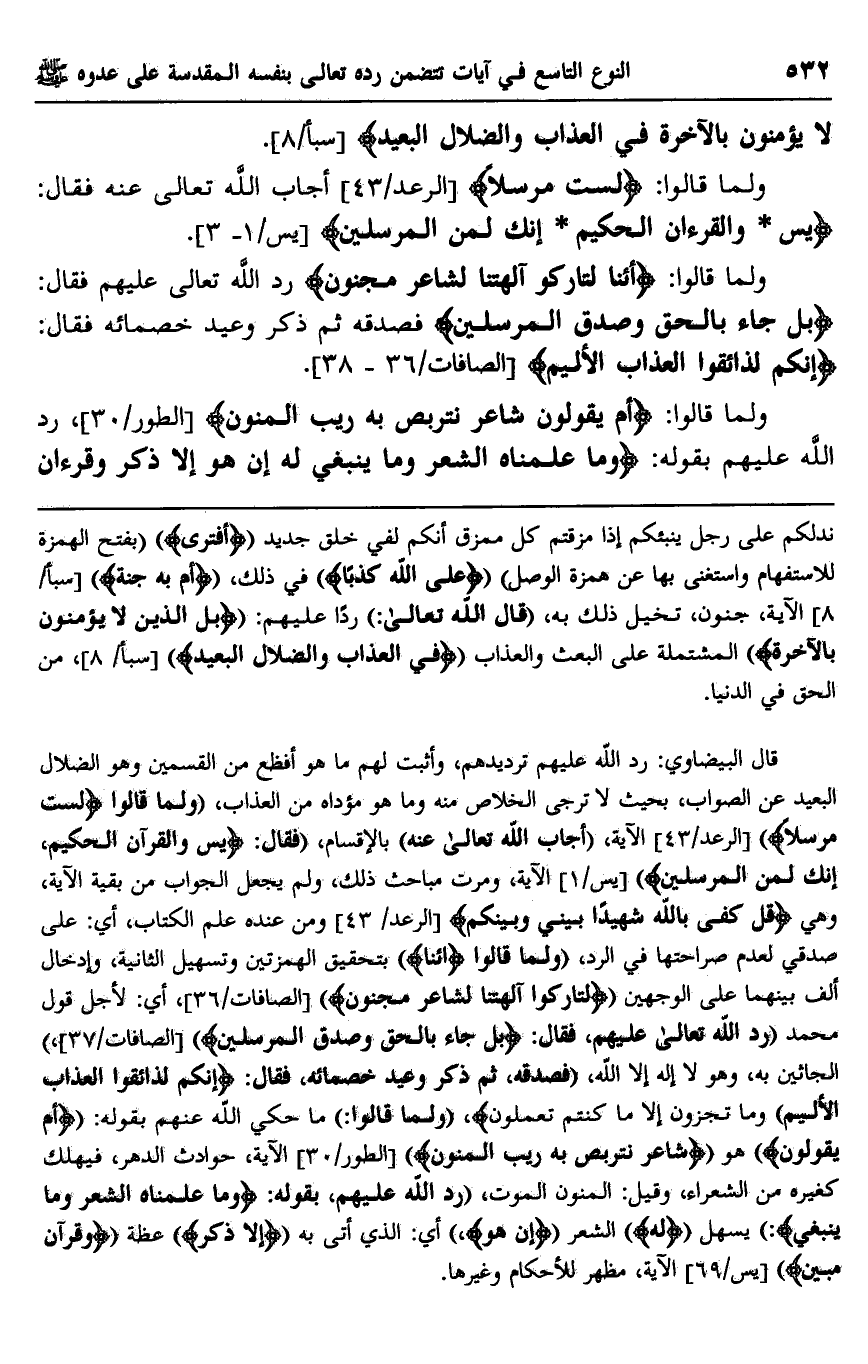 قال البيضاوي: رد الله عليهم ترديدهم، وأثبت لهم ما هو أفظع من القسمين وهو الضلال البعيد عن الصواب، بحيث لا ترجى الخلاص منه وما هو مؤداه من العذاب، "ولما قالوا {لَسْتَ مُرْسَلًا} [الرعد: 43] الآية، "أجاب الله تعالى عنه" بالإقسام، "فقال: {يس، وَالْقُرْآنِ الْحَكِيمِ، إِنَّكَ لَمِنَ الْمُرْسَلِينَ} [يس: 1] الاية، ومرت مباحث ذلك، ولم يجعل الجواب من بقية الآية وهي {قُلْ كَفَى بِاللَّهِ شَهِيدًا بَيْنِي وَبَيْنَكُمْ} [الرعد: 43] ومن عنده علم الكتاب، أي: على صدقي لعدم صراحتها في الرد، "ولما قالوا {أَئِنَّا} بتحقيق الهمزتين وتسهيل الثانية، وإدخال ألف بينهما على الوجهين " {لَتَارِكُوا آلِهَتِنَا لِشَاعِرٍ مَجْنُونٍ} " [الصافات: 36] ، أي: لأجل قول محمد "رد الله تعالى عليهم، فقال: {بَلْ جَاءَ بِالْحَقِّ وَصَدَّقَ الْمُرْسَلِينَ} [الصافات: 37] " الجاثين به، وهو لا إله إلا الله، "فصدقه، ثم ذكر وعيد خصمائه، فقال: {إِنَّكُمْ لَذَائِقُو الْعَذَابِ الْأَلِيمِ وَمَا تُجْزَوْنَ إِلَّا مَا كُنْتُمْ تَعْمَلُونَ} "، "ولما قالوا": ما حكى الله عنهم بقوله: {أَمْ يَقُولُون} هو " {شَاعِرٌ نَتَرَبَّصُ بِهِ رَيْبَ الْمَنُونِ} " [الطور: 30] الآية، حوادث الدهر، فيهلك كغيره من الشعراء، وقيل: المنون الموت، "رد الله عليهم، بقوله: " {وَمَا عَلَّمْنَاهُ الشِّعْرَ وَمَا يَنْبَغِي} " يسهل {لَهُ} الشعر {إِنْ هُوَ} ، أي: الذي أتى به {إِلَّا ذِكْرٌ} عظة {وَقُرْآنٍ مُبِين} [يس: 69] الآية، مظهر للأحكام وغيرها.