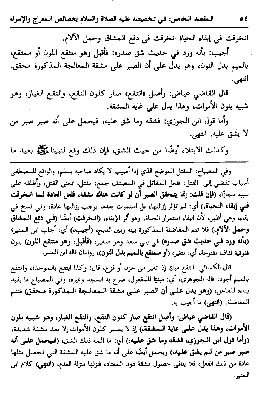 وفي المصباح: المقتل الموضع الذي إذا أصيب لا يكاد صاحبه يسلم، والواقع للمصطفى أسباب تفضي إلى القتل، فلعل المقاتل في المصنف جمع: مقتل، بمعنى القتل، وأطلقه على سببه مجازًا، "فإن قلت: إنما يتحقق الصبر أن لو كانت هناك مشقة، فلعل العادة لما انخرقت في إبقاء الحياة"، أي: لم تؤثر إزالتها، بل استمرت بعدما يوجب إزالتها عادة، وفي نسخ في بقاء، وهي أظهر؛ لأن البقاء استمرار الحياة، وهو أثر الإبقاء، "انخرقت" أيضًا "في دفع المشاق وحمل الآلام"، فلا تتم المفاضلة المذكورة بينه وبين الذبح، "أجيب"، أي: أجاب ابن المنير، "بأنه ورد في حديث شق صدره" في بني سعد وهو صغير، "فأقبل، وهو منتقع اللون" بنون فوقية فقاف مفتوحة، أي: متغير، "أو ممتقع بالميم بدل النون" روايتان قاله ابن المنير.