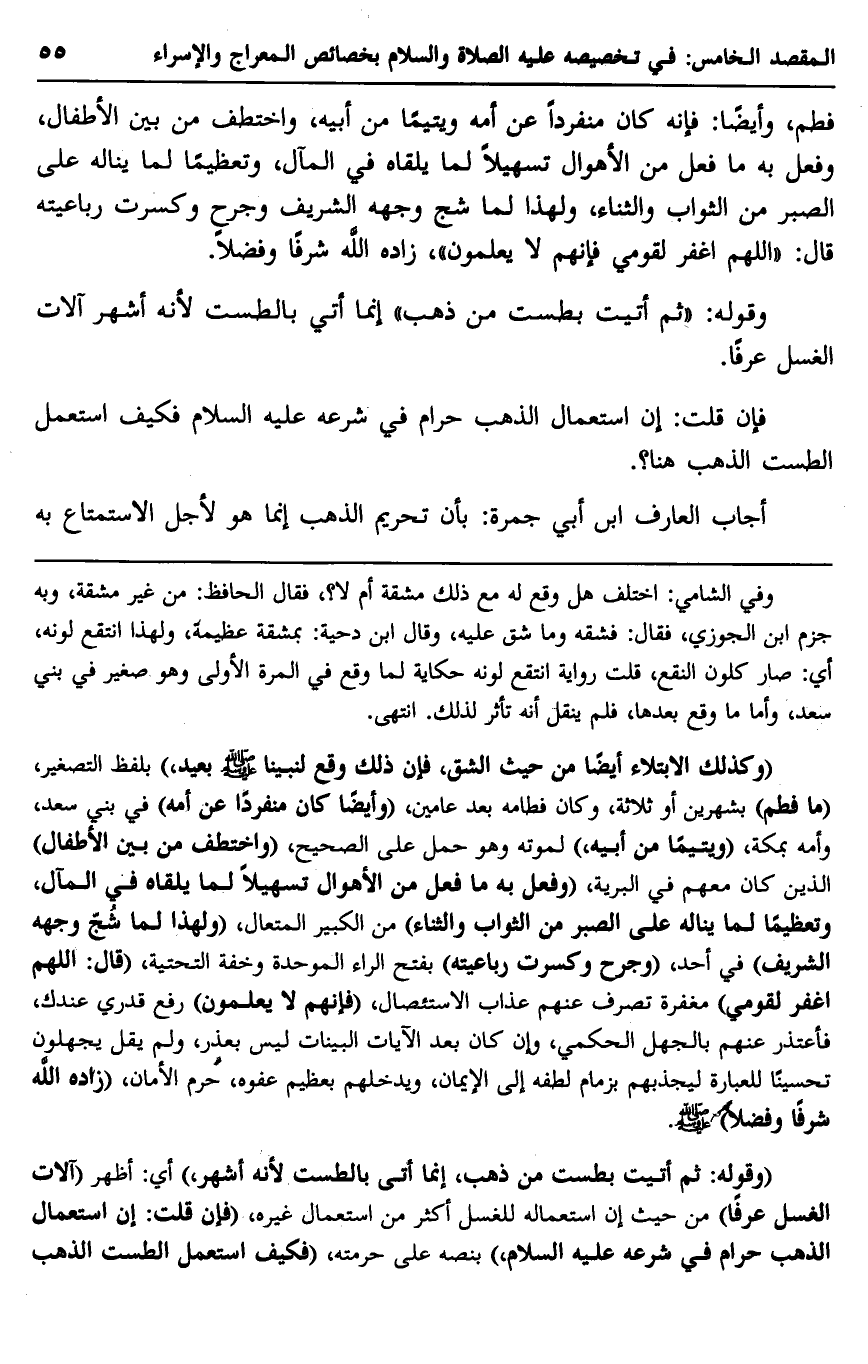 "وقوله: "ثم أتيت بطست من ذهب"، إنما أتى بالطست؛ لأنه أشهر"، أي: أظهر "آلات الغسل عرفًا" من حيث إن استعماله للغسل أكثر من استعمال غيره، "فإن قلت: إن استعمال الذهب حرام في شرعه عليه السلام"، بنصه على حرمته، "فكيف استعمل الطست الذهب