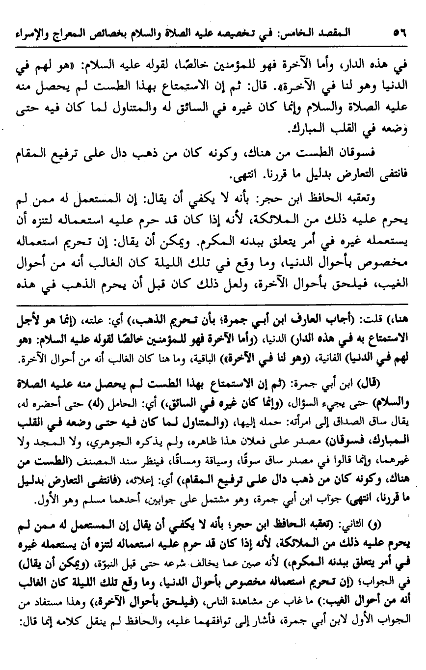 وتعقبه الحافظ ابن حجر: بأنه لا يكفي أن يقال: إن المستعمل له ممن لم يحرم عليه ذلك لمن الملائكة؛ لأنه إذا كان قد حرم عليه استعماله لتنزه أن يحرم عليه ذلك من الملائكة؛ لأنه إذا كان قد حرم عليه استعماله لتنزه أن يستعمله غيره في أمر يتعلق ببدنه المكرم، ويمكن أن يقال: إن تحريم استعماله مخصوص بأحوال الدنيا، وما وقع في تلك الليلة كان الغالب أنه من أحوال الغيب، فيلحق بأحوال الآخرة، ولعل ذلك كان قبل أن يحرم الذهب في هذه