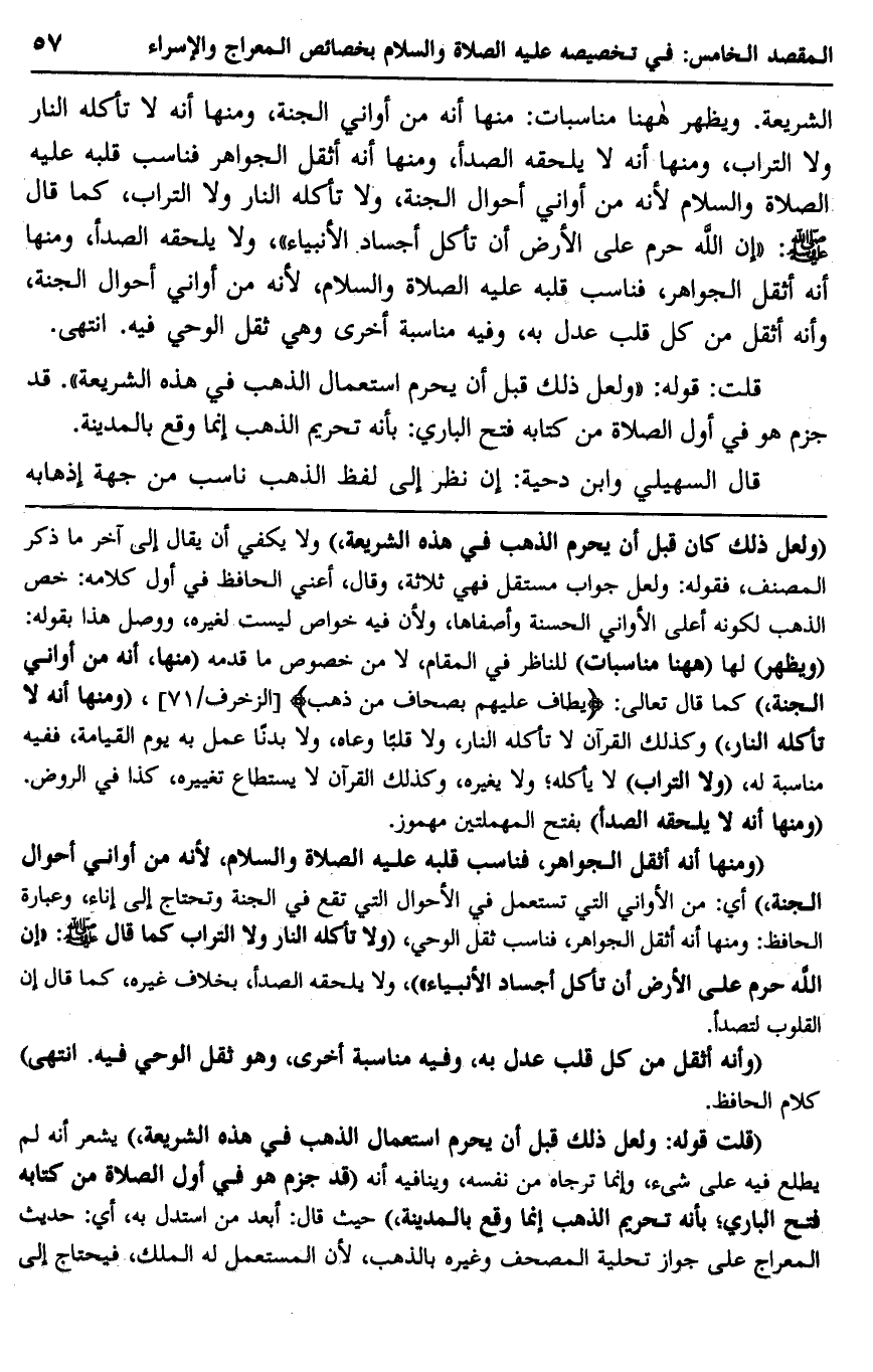 "قلت قوله: ولعل ذلك قبل أن يحرم استعمال الذهب في هذه الشريعة"، يشعر أنه لم يطلع فيه على شيء، وإنما ترجاه من نفسه، وينافيه أنه قد جزم هو في أول الصلاة من كتابه فتح الباري، بأنه تحريم الذهب إنما وقع بالمدينة"، حيث قال: أبعد من استدل به، أي: حديث المعراج على جواز تحلية المصحف وغيره بالذهب؛ لأن المستعمل له الملك، فيحتاج إلى