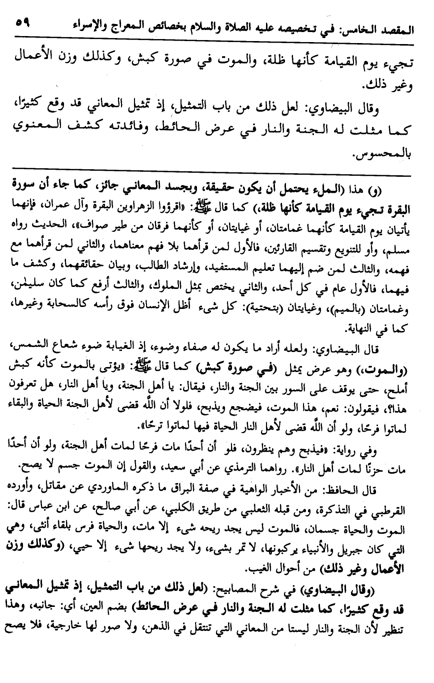 تجئ يوم القيامة، كأنها ظلة، والموت في صورة كبش، وكذلك وزن الأعمال وغير ذلك.