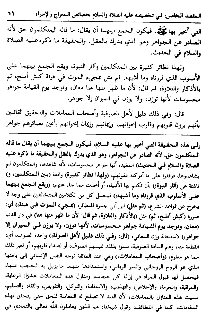 ولهذا نظائر كثيرة بين المتكلمين وآثار النبوة، ويقع الجمع بينهما على الأسلوب الذي قررناه وما أشبهه، ثم مثل بمجيء الموت في هيئة كبش أملح، ثم بالأذكار والتلاوة، ثم قال: لأن ما ظهر منها هنا معان، وتوجد يوم القيامة جواهر محسوسات؛ لأنها توزن، ولا يوزن في الميزان إلا جواهر.