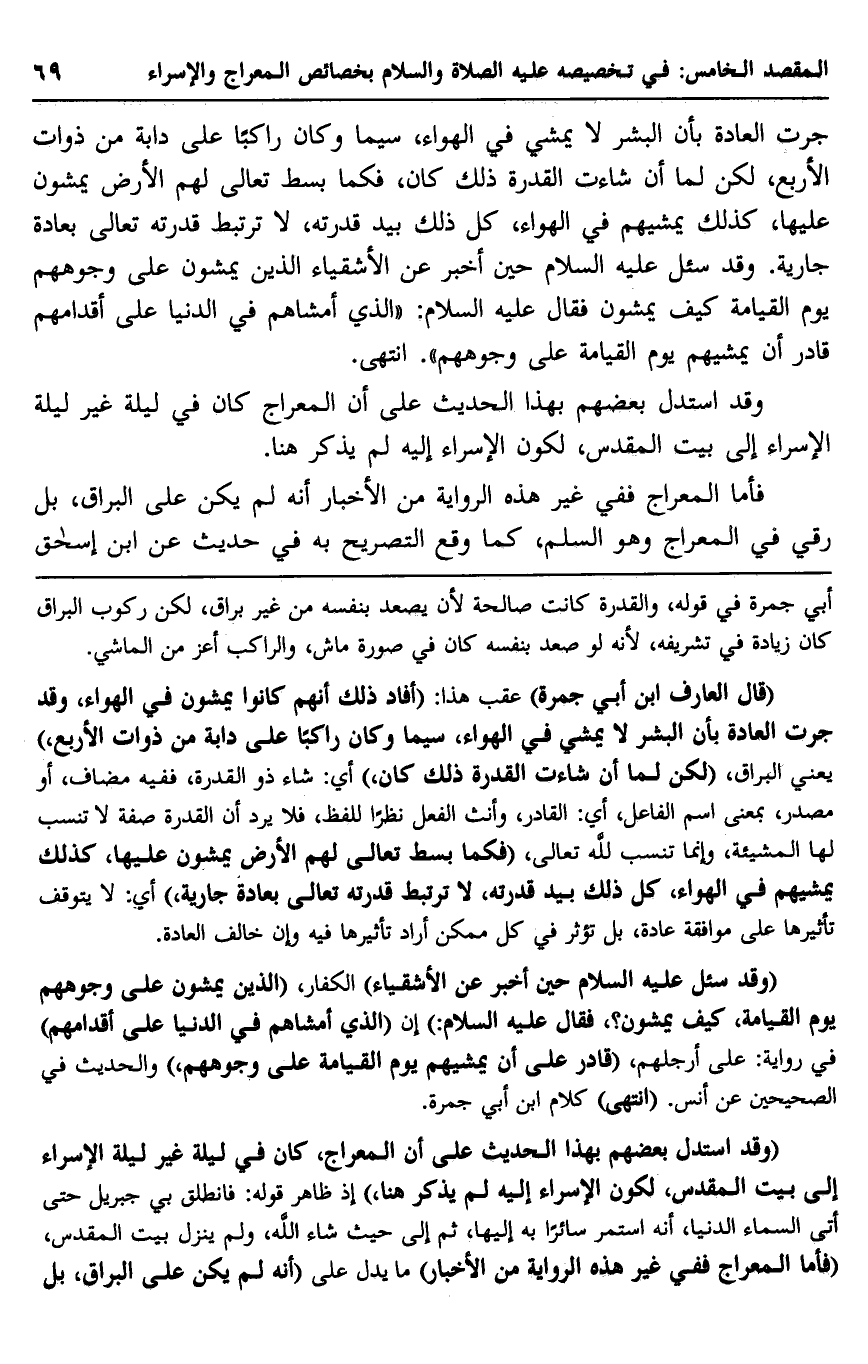 "وقد سئل عليه السلام حين أخبر عن الأشقياء" الكفار، "الذين يمشون على وجوههم يوم القيامة، كيف يمشون؟ فقال عليه السلام": "إن الذي أمشاهم في الدنيا على أقدامهم" في رواية: "على أرجلهم"، "قادر على أن يمشيهم يوم القيامة على وجوههم"، والحديث في الصحيحين عن أنس. "انتهى" كلام ابن أبي جمرة.