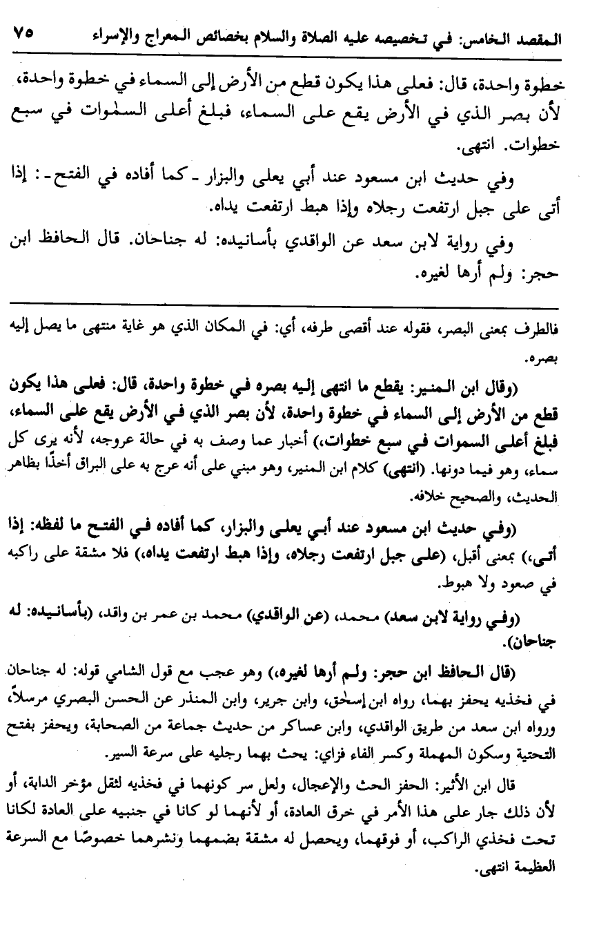 "وقال ابن المنير: يقطع ما انتهى إليه بصره في خطوة واحدة، قال: فعلى هذا يكون قطع من الأرض إلى السماء في خطوة واحدة؛ لأن بصر الذي في الأرض يقع على السماء، فبلغ أعلى السموات في سبع خطوات"، أخبار عما وصف به في حالة عروجه؛ لأنه يرى كل سماء، وهو فيما دونها. "انتهى" كلام ابن المنير، وهو مبني على أنه عرج به على البراق أخذا بظاهر الحديث، والصحيح خلافه.