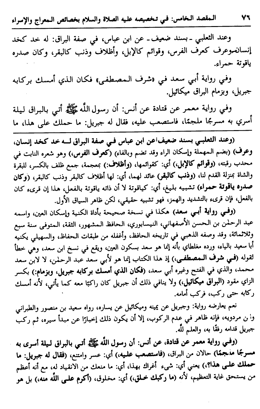 "وعند الثعلبي بسند ضعيف عن ابن عباس في صفة البراق له خد كخد إنسان، وعرف" "بضم المهملة وإسكان الراء وقد تضم وبالفاء" "كعرف الفرس"، وهو شعره النابت في محدب رقبته، "وقوائم كالإبل"، أي: كقوائمها، "وأظلاف": بمعجمة: جمع ظلف بالكسر، للبقرة والشاة بمنزلة القدم لنا، "وذنب كالبقر" عائد لهما، أي: لها أظلاف كالبقر وذنب كالبقر، "وكان صدره ياقوتة حمراء" تشبيه بليغ، أي: كياقوتة لا أن ذاته ياقوتة بالفعل، هذا إن قرئ كان بالفعل، فإن قرئ بالتشديد والهمز، فهو تشبيه حقيقي، لكن ظاهر السياق الأول.