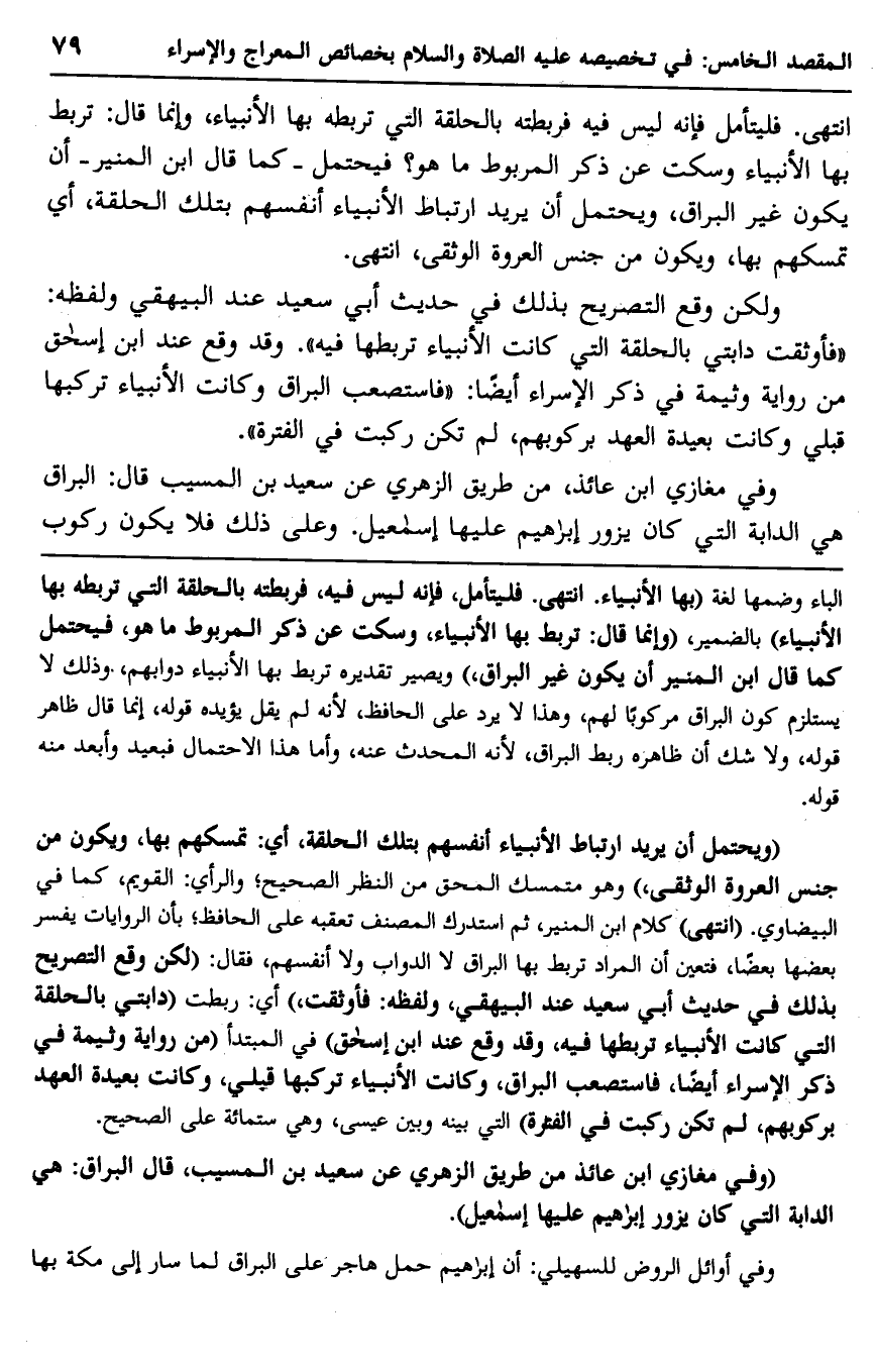 انتهى، فليتأمل فإنه ليس فيه فربطته التي تربطه بها الأنبياء، وإنما قال: تربط بها الأنبياء وسكت عن ذكر المربوط ما هو؟ فيحتمل -كما قال ابن المنير- أن يكون غير البراق، ويحتمل أن يريد ارتباط الأنبياء أنفسهم بتلك الحلقة، أي تمسكهم بها، ويكون من جنس العروة الوثقى، انتهى.