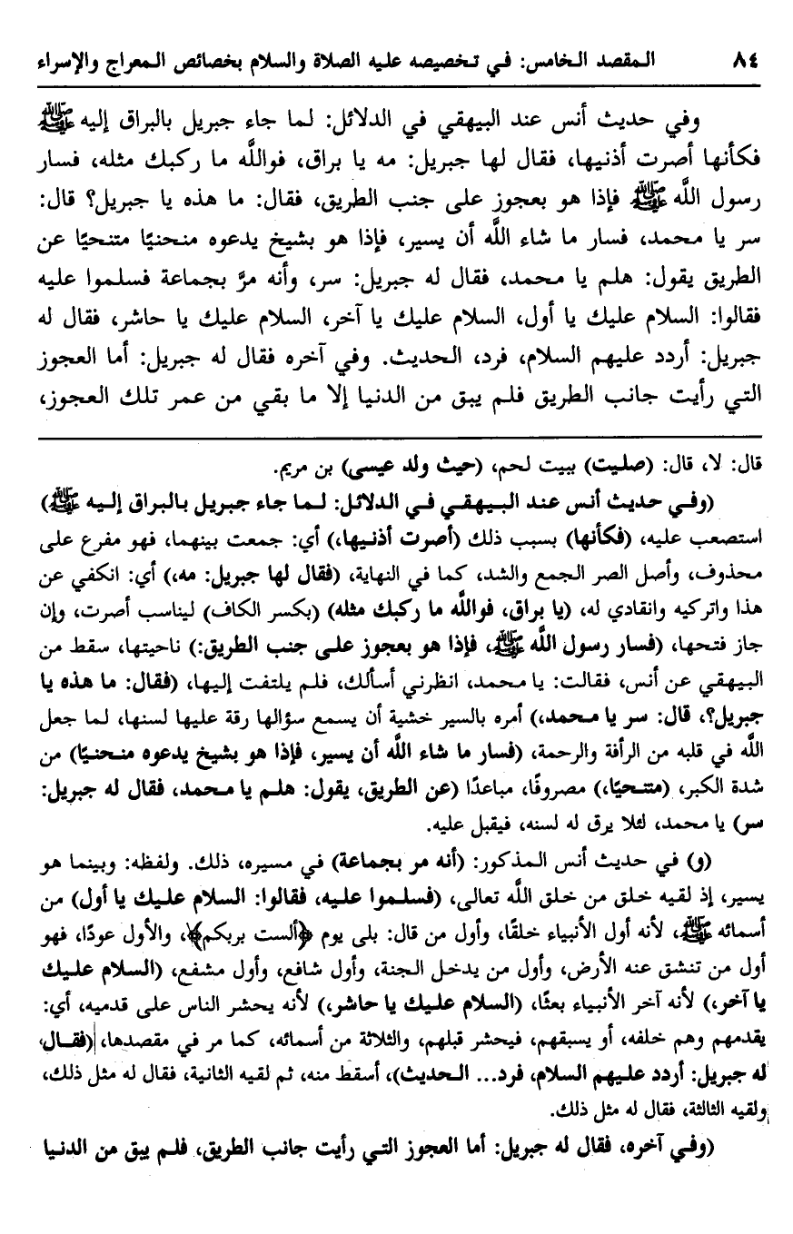 وفي حديث أنس عند البيهقي في الدلائل: لما جاء جبريل بالبراق إليه -صلى الله عليه وسلم- فكأنها أصرت أذنيها، فقال لها جبريل: مه يا براق، فوالله ما ركبك مثله، فسار رسول الله -صلى الله عليه وسلم- فإذا هو بعجوز على جنب الطريق، فقال: "ما هذه يا جبريل"؟ قال: سر يا محمد، فسار ما شار الله أن يسير، فإذا هو بشيخ يدعوه منحنيًا متنحيا عن الطريق يقول: هلم يا محمد، فقال له جبريل: سر، وأنه مر بجماعة فسلموا عليه فقالوا: السلام عليك يا أول، السلام عليك يا آخر، السلام عليك يا حاشر، فقال له جبريل: أردد عليهم السلام، فرد، الحديث، وفي آخره فقال له جبريل: أما العجوز التي رأيت جانب الطريق، فلم يبق من الدنيا إلا ما بقي من عمر تلك العجوز،