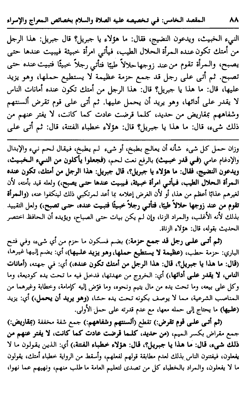 النيئ الخبيث، ويدعون النضيج، فقال: "ما هؤلاء يا جبريل"؟ قال جبريل: هذا الرجل من أمتك تكون عنده المرأة الحلال الطيب، فيأتي امرأة خبيثة فيبيت عندها حتى يصبح، والمرأة تقوم من عند زوجها حلالًا طيبا، فتأتي رجلًا خبيثًا فتبيت عنده حتى تصبح، ثم أتى على رجل قد جمع حزمة عظيمة لا يستطيع حملها، وهو يزيد عليها، قال: "ما هذا يا جبريل"؟ قال: هذا الرجل من أمتك تكون عنده أمانات الناس لا يقدر على أدائها، وهو يريد أن يحمل عليها، ثم أتى على قوم تقرض ألسنتهم وشفاههم بمقاريض من حديد كلما قرضت عادت كما كانت، لا يفتر عنهم من ذلك شيء، قال: "ما هذا يا جبريل"؟ قال: هؤلاء خطباء الفتنة، قال: ثم أتى على