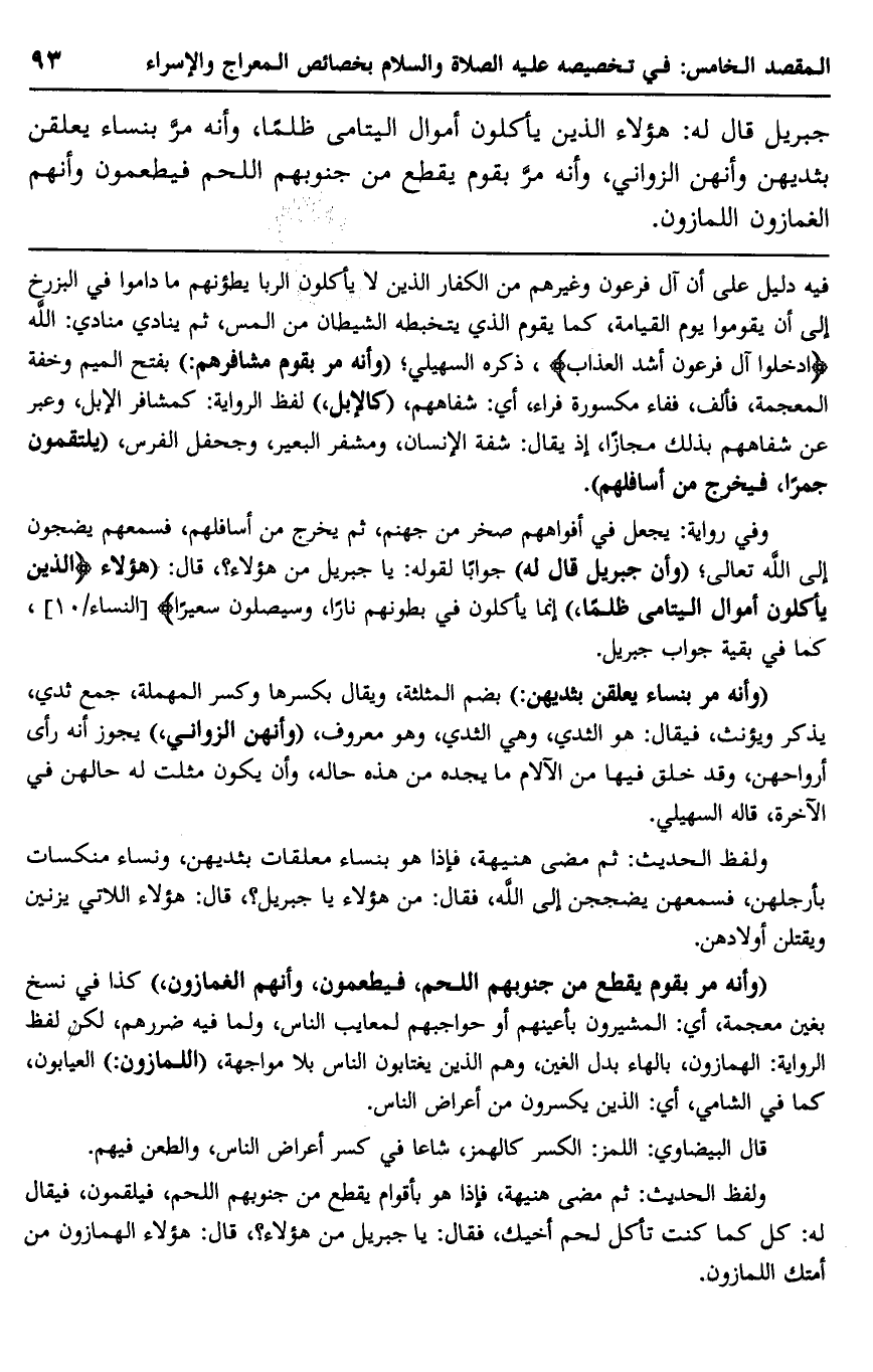 جبريل قاله له: هؤلاء الذين يأكلون أموال اليتامى ظلمًا، وأنه مر بنساء يعلقن بثديهن وأنهن الزواني، وأنه مر بقوم يقطع من جنوبهم اللحم فيطعمون، وأنهم الغمازون اللمازون.