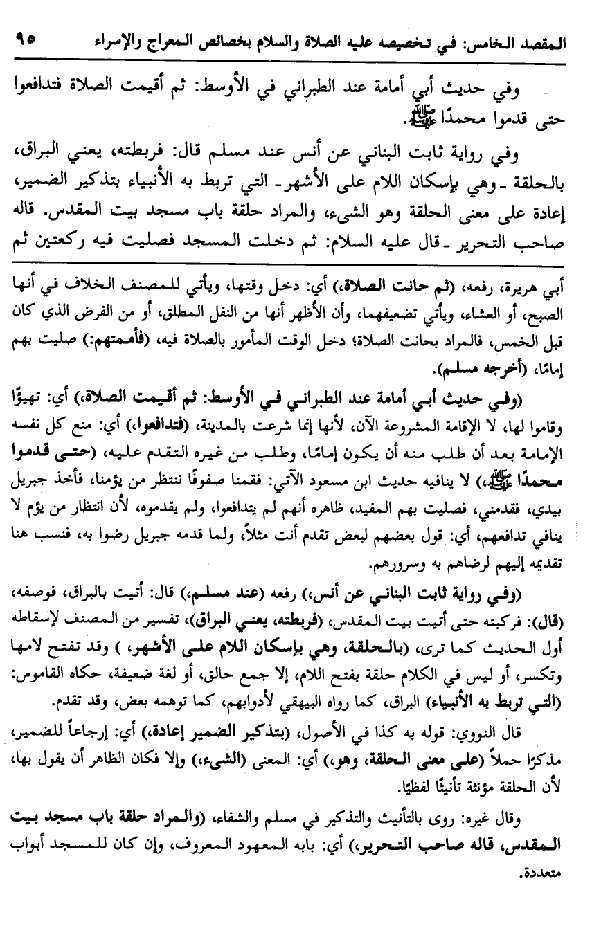 وفي رواية ثابت البناني عن أنس عند مسلم قال: "فربطته"، يعني البراق، بالحلقة -وهي بإسكان اللام على الأشهر- التي تربط به الأنبياء بتذكير الضمير، إعادة على معنى الحلقة وهو الشيء، والمراد حلقة باب مسجد بيت المقدس، قاله صاحب التحرير- قال عليه السلام: "ثم دخلت المسجد فصليت فيه ركعتين، ثم