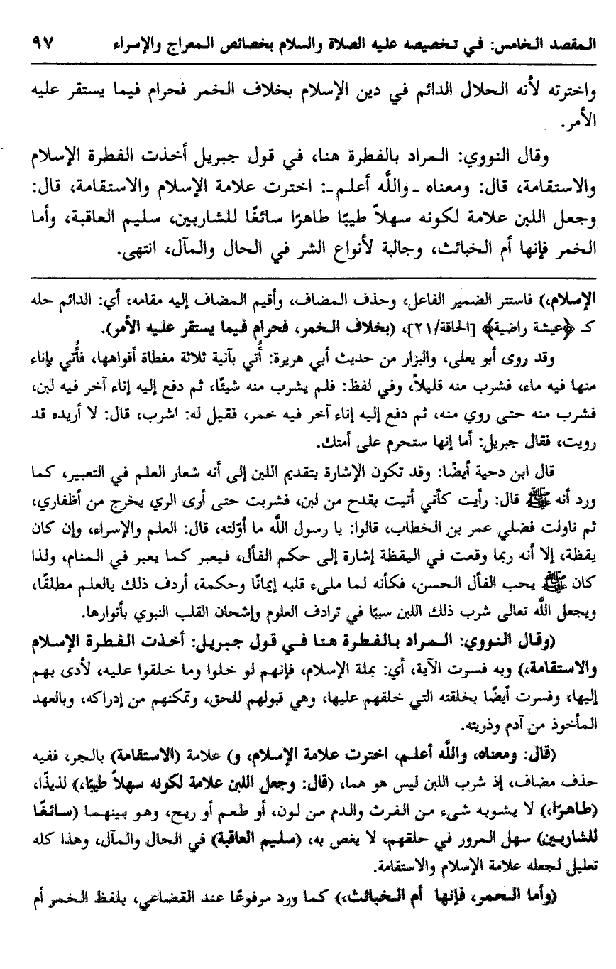 وقال النووي: المراد بالفطرة هنا، في قول جبريل: أخذت الفطرة الإسلام والاستقامة، قال: ومعناه -والله أعلم-: اخترت علامة الإسلام والاستقامة، قال: وجعل اللبن علامة لكونه سهلًا طيبًا طارهًا سائغًا للشاربين، سليم العاقبة، وأما الخمر فإنها أم الخبائث، وجالبة الأنواع الشر في الحال والمآل. انتهى.