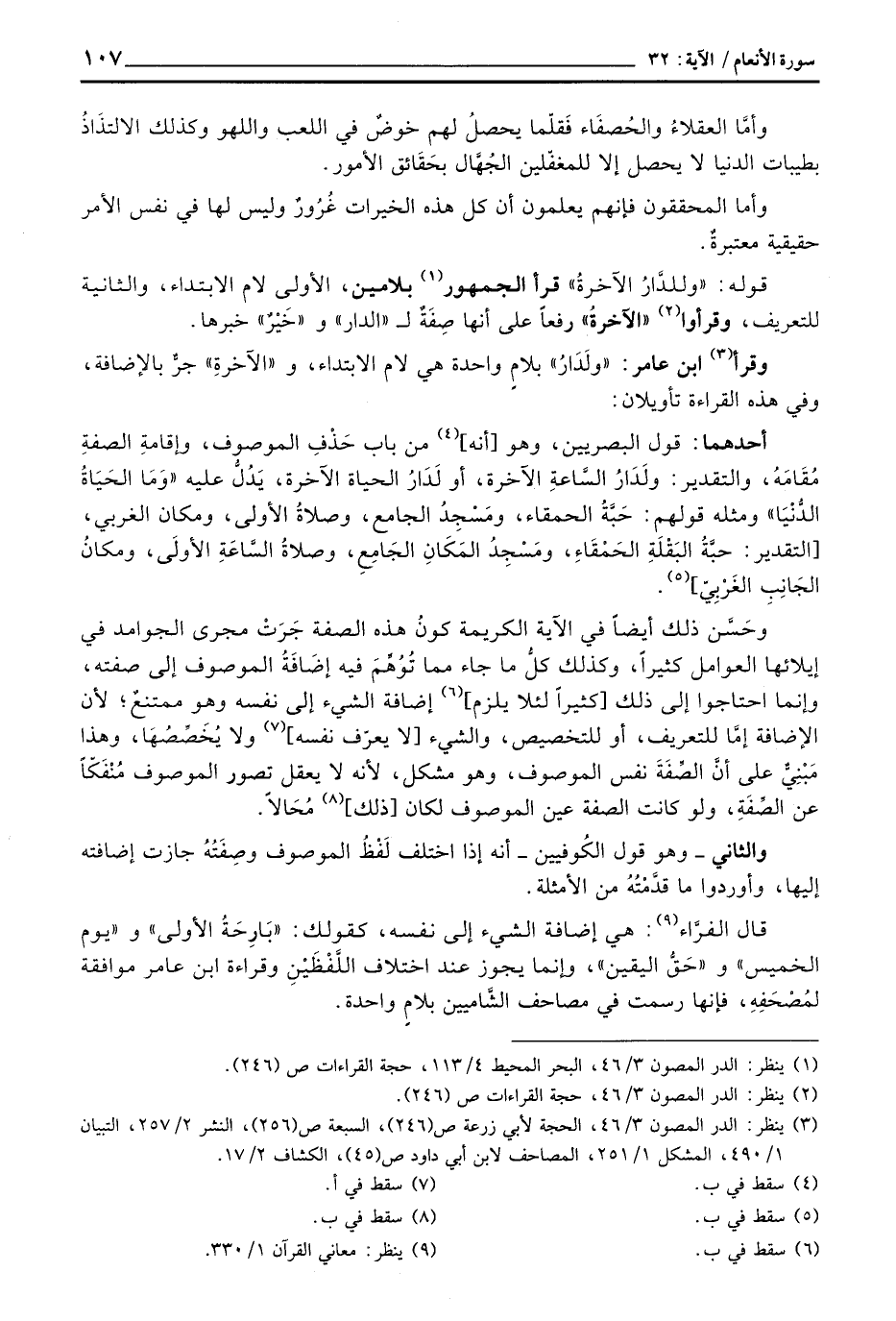 وقرأ ابن عامر: «ولَدَارُ» بلامٍ واحدة هي لام الابتداء، و «الآخرةِ» جرُّ بالإضافة، وفي هذا القراءة تأويلان: