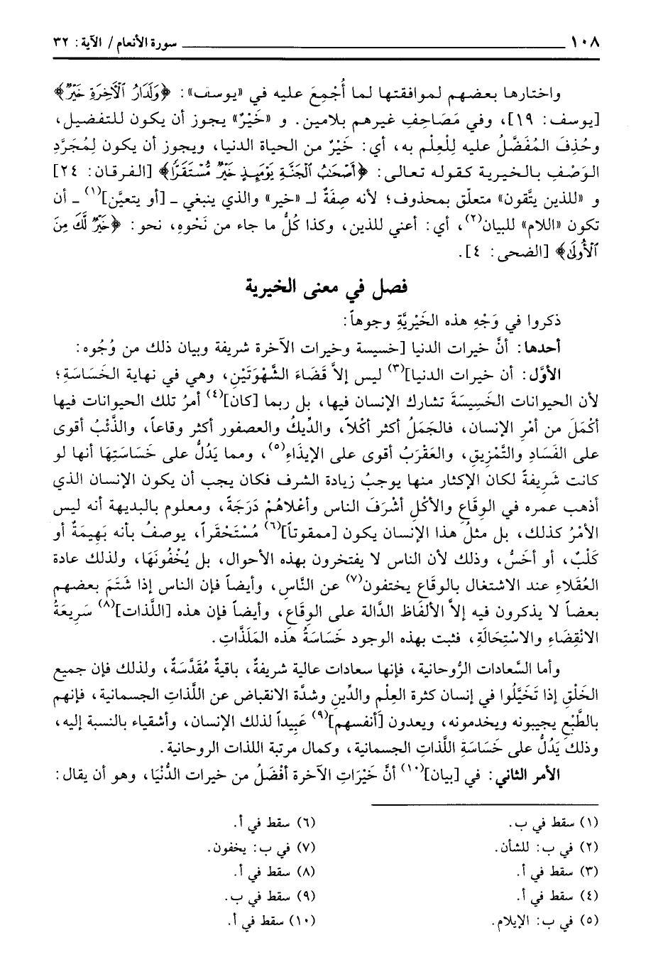 أحدهما: أنَّ خيرات الدينا [خسيسة وخيرات الآخرة شريفة وبيان ذلك في وُجُوه: