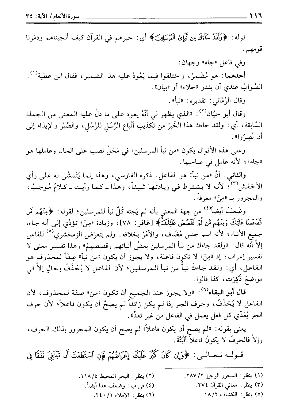 وضُعفَ أيضاً من جهة المعنى بأنه لم يَجئه كُلُّ نبأ للمرسلين؛ لقوله: {مِنْهُم مَّن قَصَصْنَا عَلَيْكَ وَمِنْهُمْ مَّن لَّمْ نَقْصُصْ عَلَيْكَ} [غافر: 78] ، وزيادة» مِنْ «تؤدِّي إلى أنه جاءه جميع الأنبياء؛ لأنه اسم جنس مُضَاف، والأمْرُ بخلافه. ولم يتعرّض الزمخشري للفاعل إلاَّ أنه قال:» ولقد جاءك من نبأ المرسلين بعضُ أنبائهم وقصصهمْ «وهذا تفسير معنى لا تفسير إعراب؛ إذ» مِنْ «لا تكون فاعله، ولا يجوز أن يكون» من نبأ «صِفَةً لمخذوف هو الفاعل، أي: ولقد جاءكَ نبأ من نبأ المرسلين؛ لأن الفاعل لا يُحْذّفُ بحالٍ إلاَّ في مواضعَ ذُكِرَت، كذا قالوا.