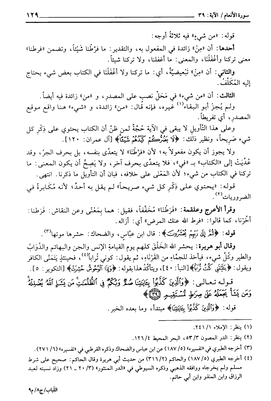 ولا يجوز أن يكون ب «في» ، فلا يتعدَّى بحرف آخر، ولا يَصِحُّ أن يكون المعنى: ما تركنا في الكتاب من شيء؛ لأن المَعْنَى على خلافه، فبان أن التأويل ما ذكرنا. انتهى.